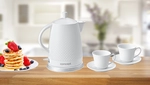 Keramická rýchlovarná kanvica RK0040 Concept s objemom 1,5 l s dvoma šálkami a podšálkami.