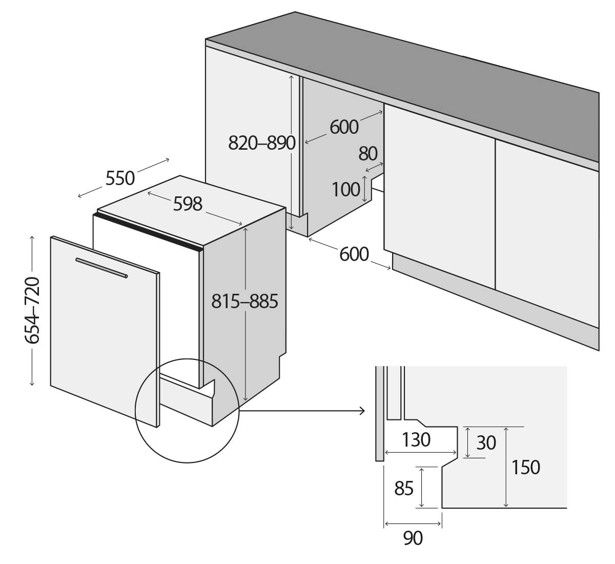 Rozmery na vstavanie (v x š x h): 815-885 x 600 x 600 (mm)