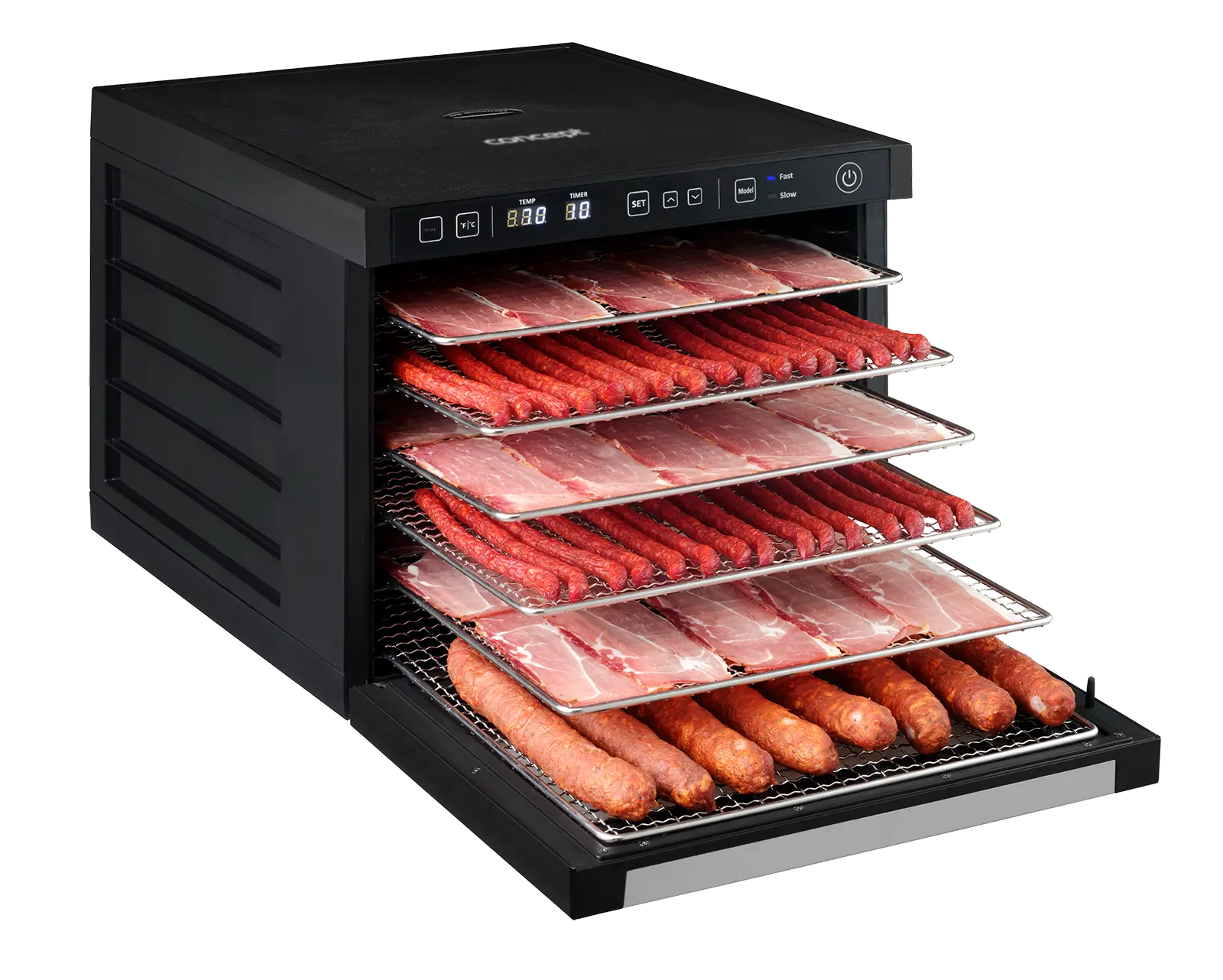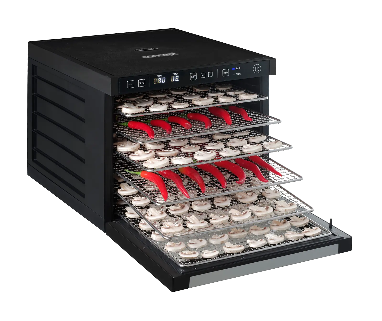 Na prehľadnom LED displeji si sami nastavíte ako dlho a na koľko stupňov chcete sušiť. Teplotu môžete pohodlne regulovať v rozmedzí od 35°C do 70°C. Digitálny časovač je možné nastaviť až na 99 hodín.