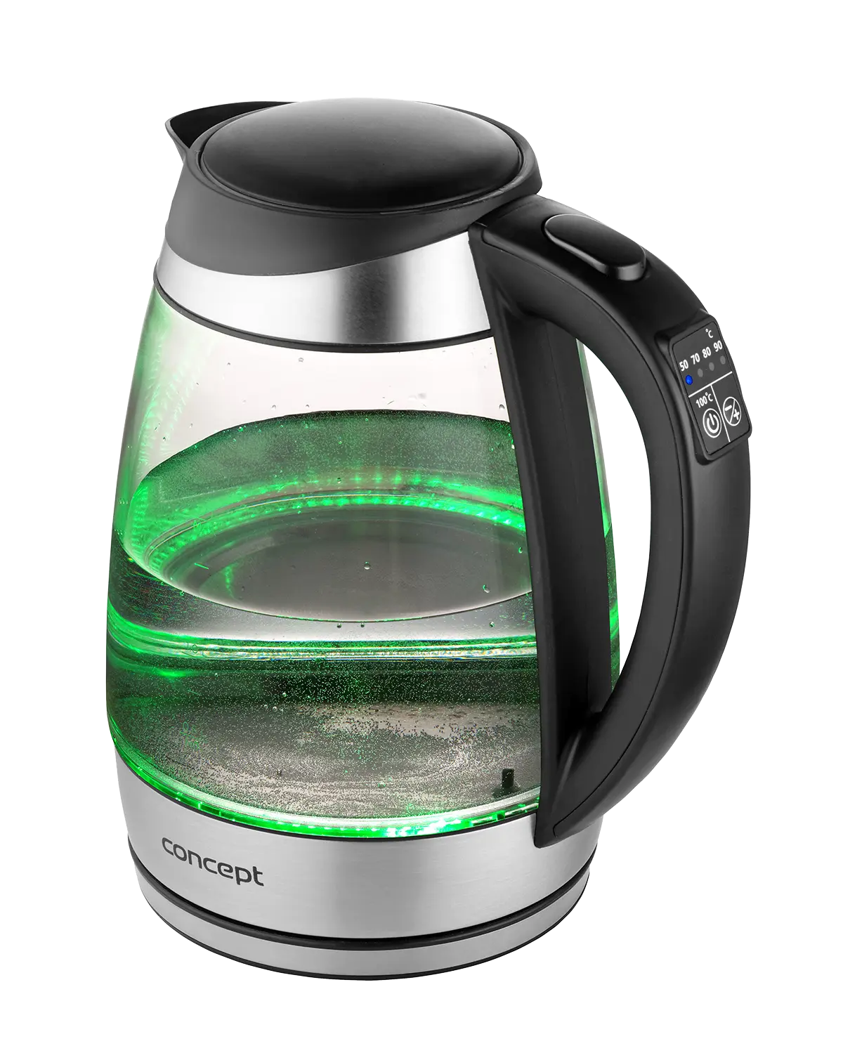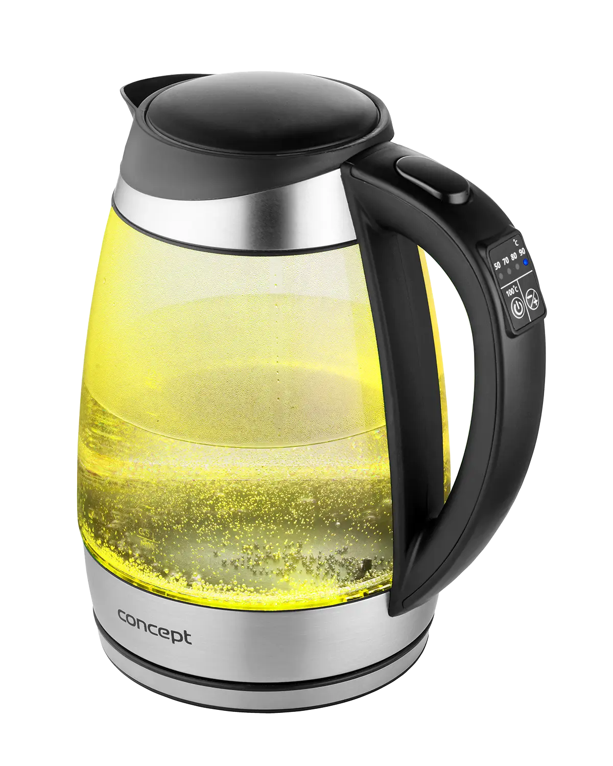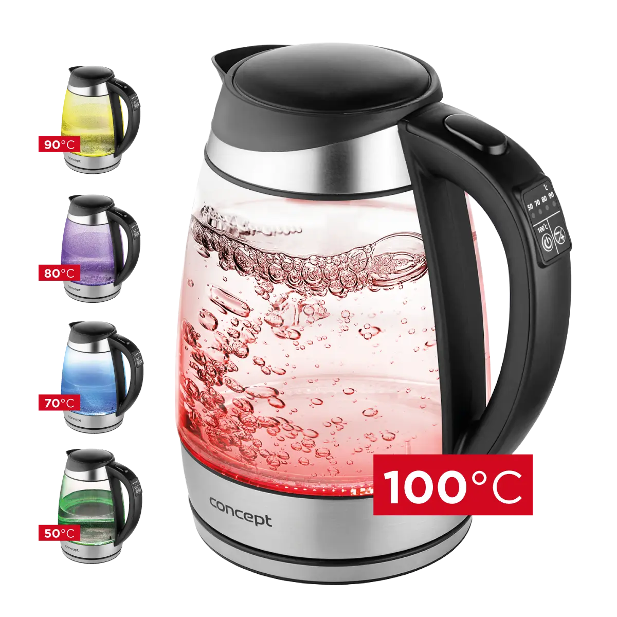 Rýchlovarná kanvica je vybavená digitálnym ovládaním s možnosťou nastavenia 7 stupňov teploty, takže v nej pripravíte všetko od detských príkrmov po najrôznejšie druhy čajov. Vyniká dizajnom dymového skla a nerezu s farebným podsvietením.