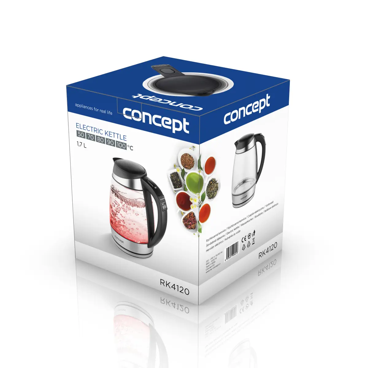 Rýchlovarná kanvica RK4120 sa vďaka univerzálnemu designu skla stane elegantným doplnkom modernej domácnosti. Príkon 2200 W je zárukou rýchleho ohrevu a s objemom 1,7 l pripravíte až 7 šálok na jedno naplnenie. Moderný vzhľad kanvice je doplnený o farebné podsvietenie závislé na zvolenej teplote, ktoré sa vďaka LED diódam aktivuje po jej zapnutí.