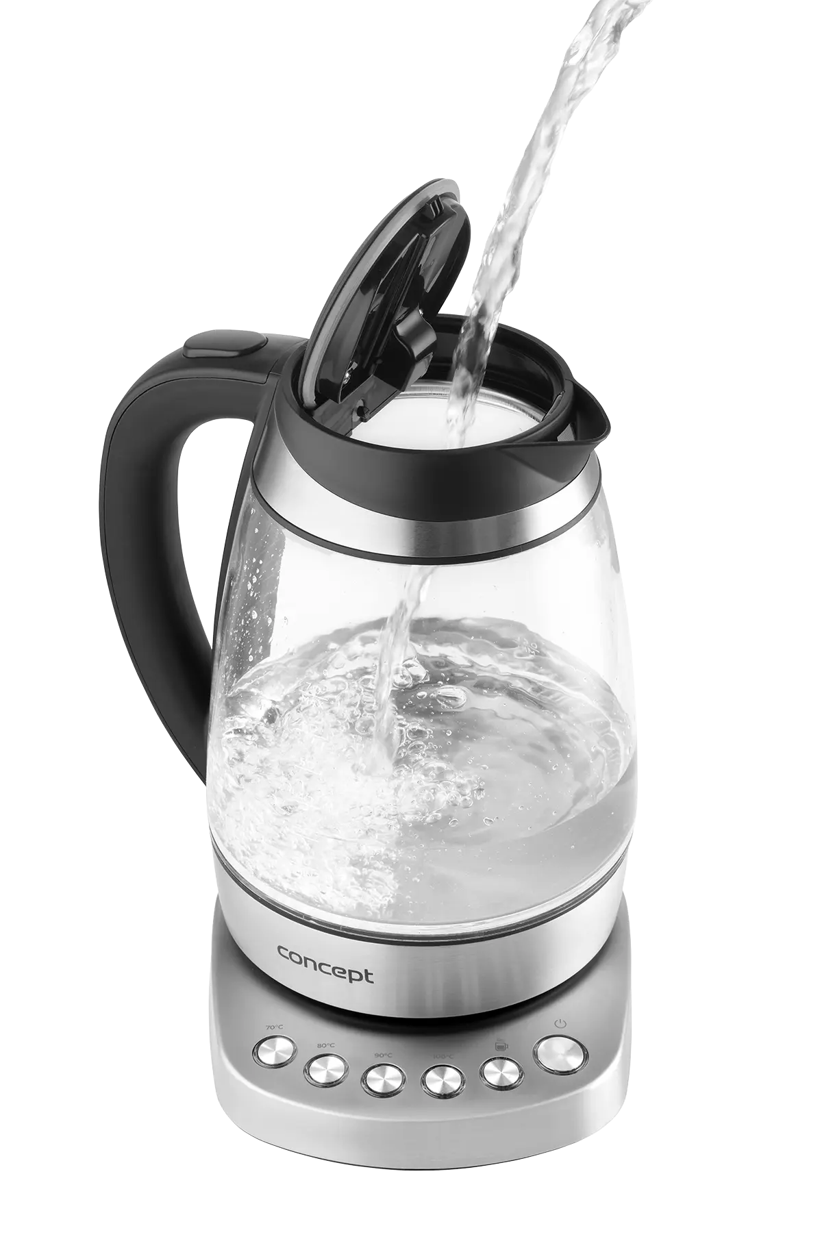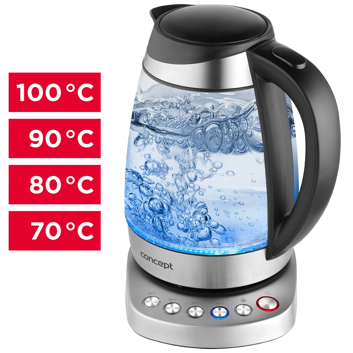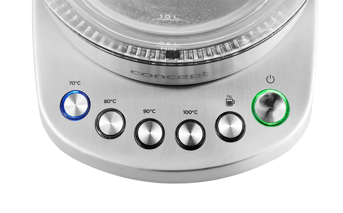 Rýchlovarná kanvica je vybavená digitálnym ovládaním s možnosťou nastavenia 7 stupňov teploty, takže v nej pripravíte všetko od detských príkrmov po najrôznejšie druhy čajov. Vyniká dizajnom dymového skla a nerezu s farebným podsvietením.