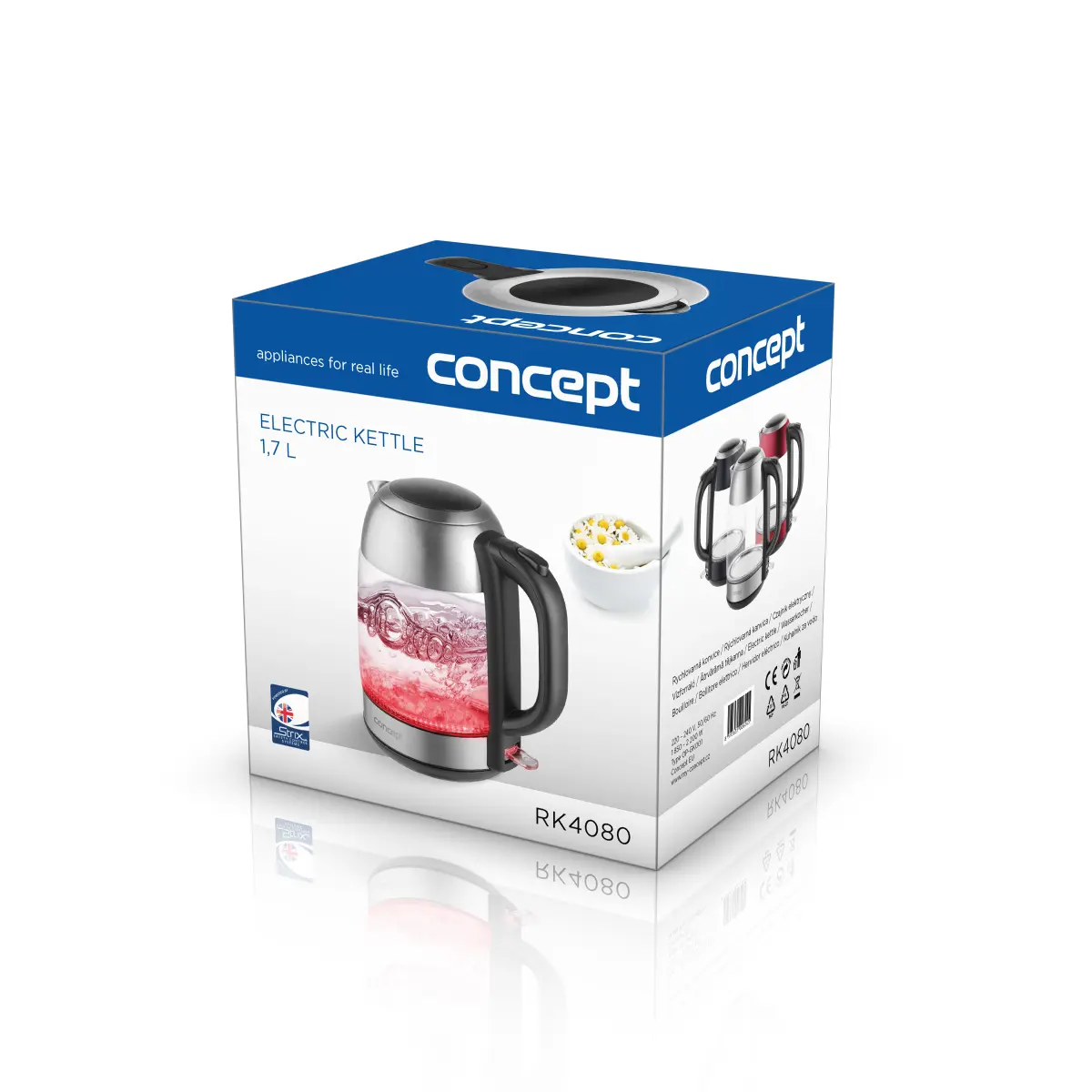 Sklenená rýchlovarná kanvica 1,7 l Concept; RK4081; Borosilikátové sklo; Značkový konektor STRIX; 2 farebné varianty; Design; Rýchlovarná kanvica RK4080 je spojením elegantného designu a kvalitného spracovania. Je opatrená prehľadným vodoznakom a LED d...