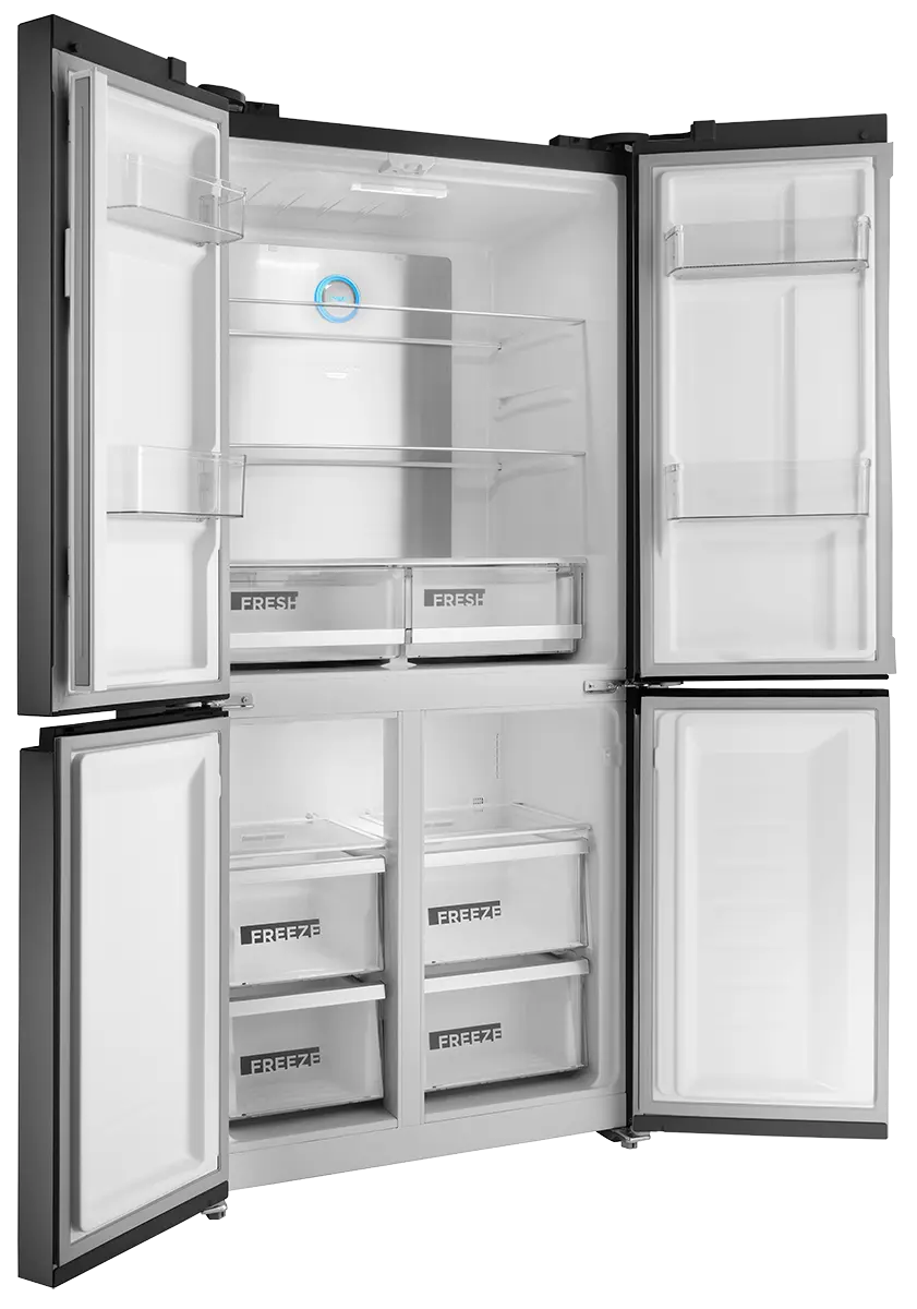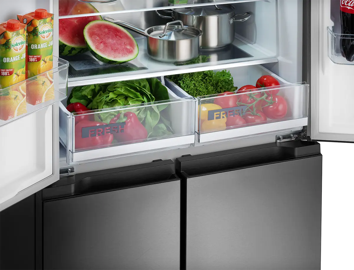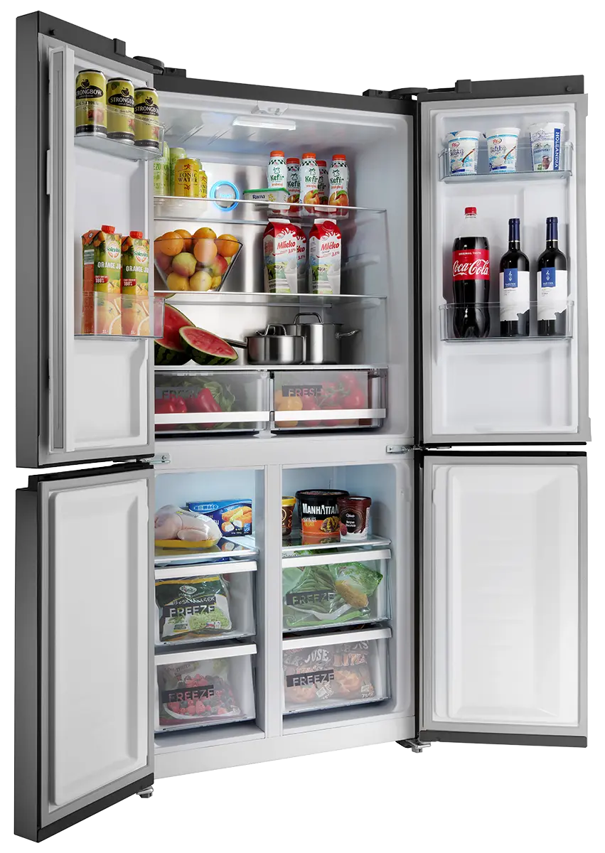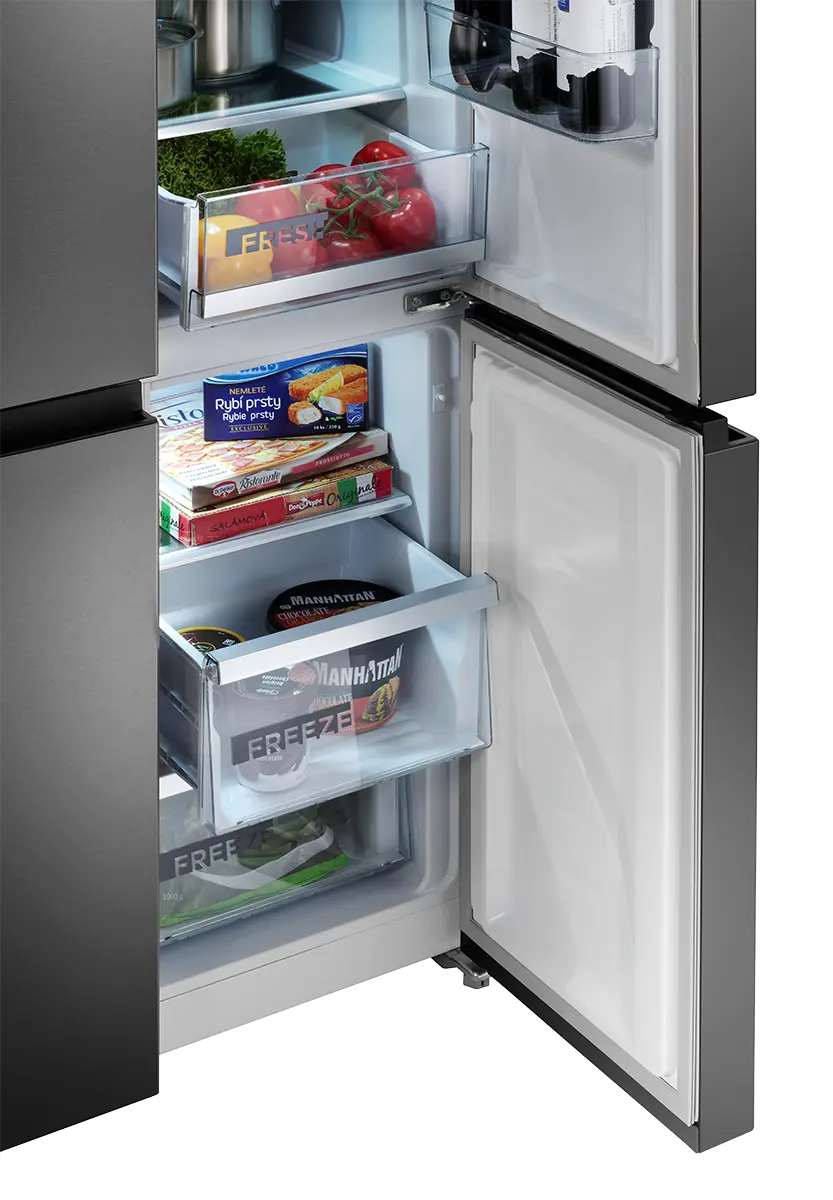 Chladnička disponuje praktickým otváraním dverí. Pre plnohodnotné vysunutie zásuviek stačí dvere chladničky otvoriť len do pravého uhla. Chladničku teda môžete umiestniť i blízko steny, ale vždy je nutné počítať s ľahkým nábehom dverí min. 20 mm.