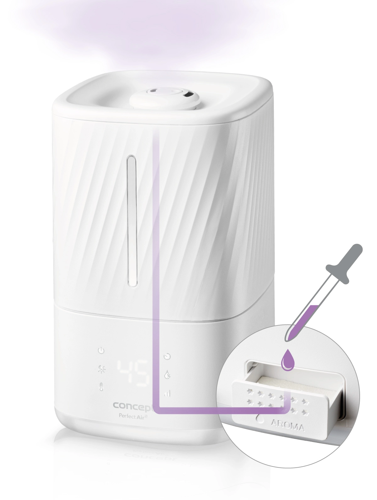 Prevoňajte svoj domov kúzelnou vôňou. Zvlhčovač vzduchu ZV2010 je vybavený špeciálnou aróma zásuvkou, do ktorej môžete kedykoľvek pridať pár kvapiek vašej obľúbenej vône, bez toho aby ste ho museli vypínať. Za okamih vytvoríte atmosféru, ktorá vám navodí príjemné pocity a uvoľní vašu myseľ alebo pomôže od zdravotných komplikácii. Vôňa eukalyptu napr. uľaví od bolesti hlavy, uvoľní dýchacie cesty a celkovo podporí váš imunitný systém; vôňa levandule, mäty a citronely odpudí muchy a komáre.