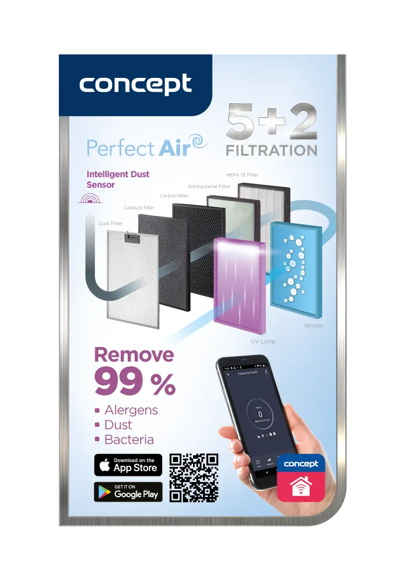 Čističku môžete ovládať odkiaľkoľvek pomocou mobilnej aplikácie Concept Home, ktorá je zadarmo dostupná pre iOS a Android. Na diaľku ju spustíte alebo vypnete, upravíte rýchlosť čistenia alebo napríklad skontrolujete aktuálny stav ovzdušia v miestnosti, kde sa práve nachádza. A pokiaľ nie ste fanúšikmi aplikácií, môžete ju ovládať cez diaľkový ovládač alebo pomocou tlačidiel priamo na displeji.