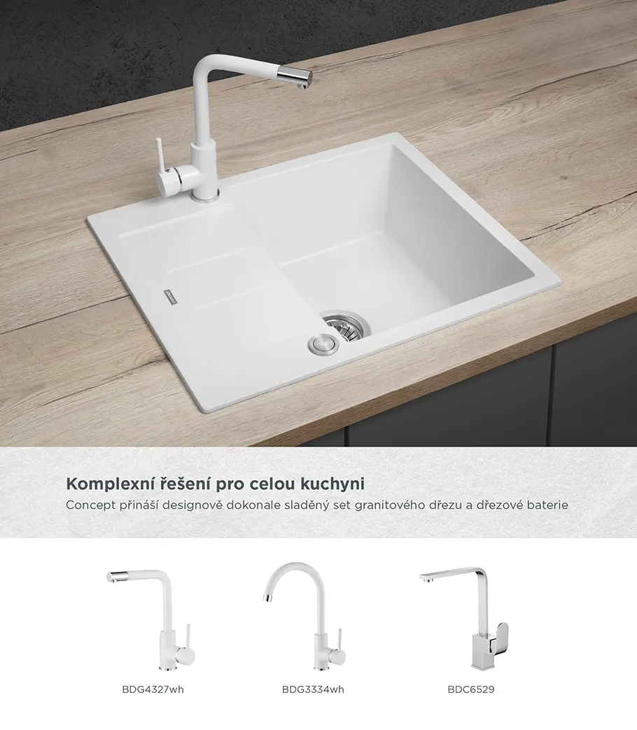 Atraktívny vzhľad, kvalitné spracovanie, vysoká odolnosť a ľahká údržba, to sú hlavné prednosti granitových drezov Concept. Perfektne zapadnú do každej kuchyne a v kombinácii s batériami Concept tvoria dokonale zladený celok. Model DG05C45wh je súčasťou designovej rady CUBIS, ktorú spájajú moderné hranaté línie a v kuchyni pôsobí veľmi nadčasovým a elegantným dojmom.