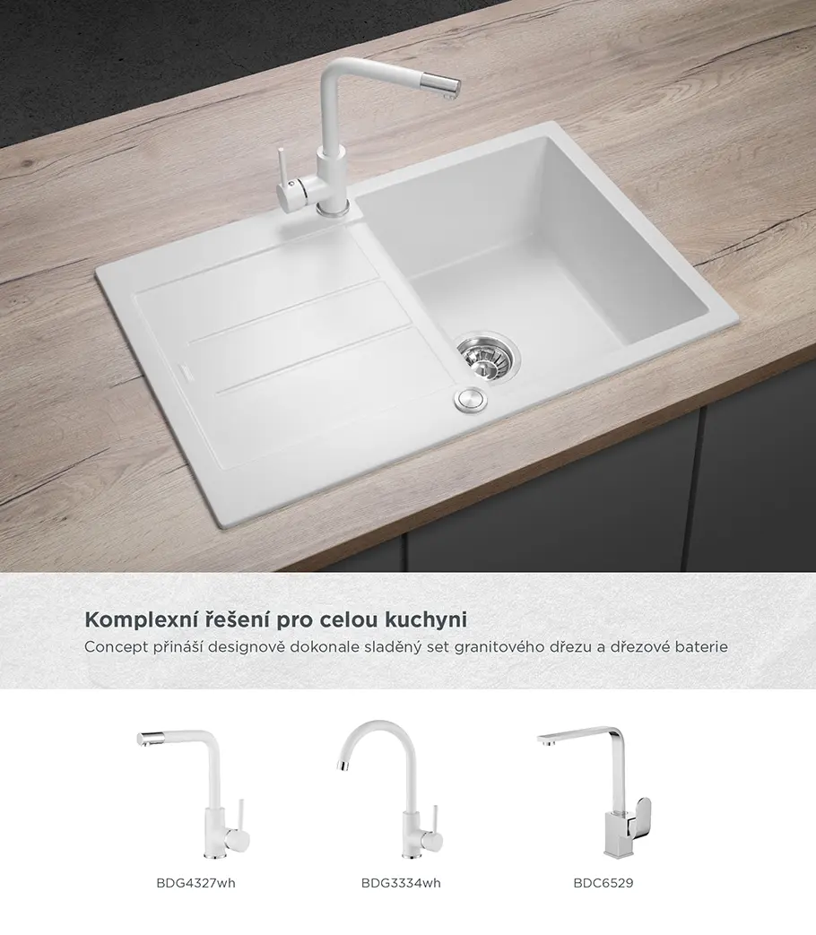 Atraktívny vzhľad, kvalitné spracovanie, vysoká odolnosť a ľahká údržba, to sú hlavné prednosti granitových drezov Concept. Perfektne zapadnú do každej kuchyne a v kombinácii s batériami Concept tvoria dokonale zladený celok. Model DG10C45wh je súčasťou designovej rady CUBIS, ktorú spájajú moderné hranaté línie a v kuchyni pôsobia veľmi nadčasovým a elegantným dojmem.