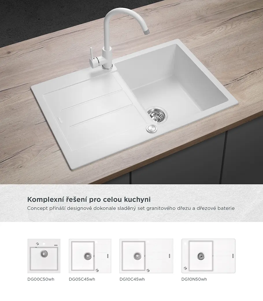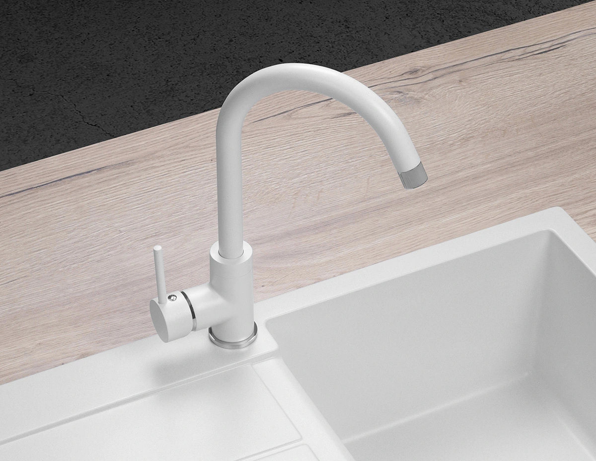 Drezová batéria BDG3334wh je spracovaná v jednoduchom a elegantnom designe. Povrch batérie tvorí kvalitná farba s designom granitového povrchu v kombinácii s lesklými chrómovými detailmi. Dokonale ladí s bielymi granitovými drezmi Concept. Tento model ponúka ďalšie 3 farebné varianty: čierna (BDG3334bc), béžová (BDG3334be) a lesklá chrómová (BDC3334).