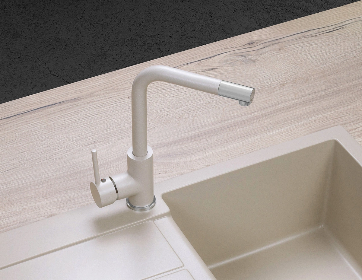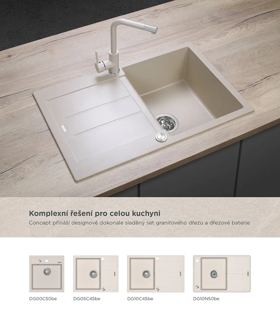 Drezová batéria BDG4327be je spracovaná v elegantnom, jednoduchom designe v tvare písmene L. Povrch batérie tvorí kvalitná farba s designom granitového povrchu v kombinácii s lesklými chrómovými detailmi. Dokonale ladí s béžovými granitovými drezmi Concept. Tento model ponúka ďalších 5 farebných variant: biela (BDG4327wh), čierna (BDG4327bc), tmavo šedá (BDG4327dg), tmavo nerezová (BDG4327ds) a lesklá chrómová (BDC4327).