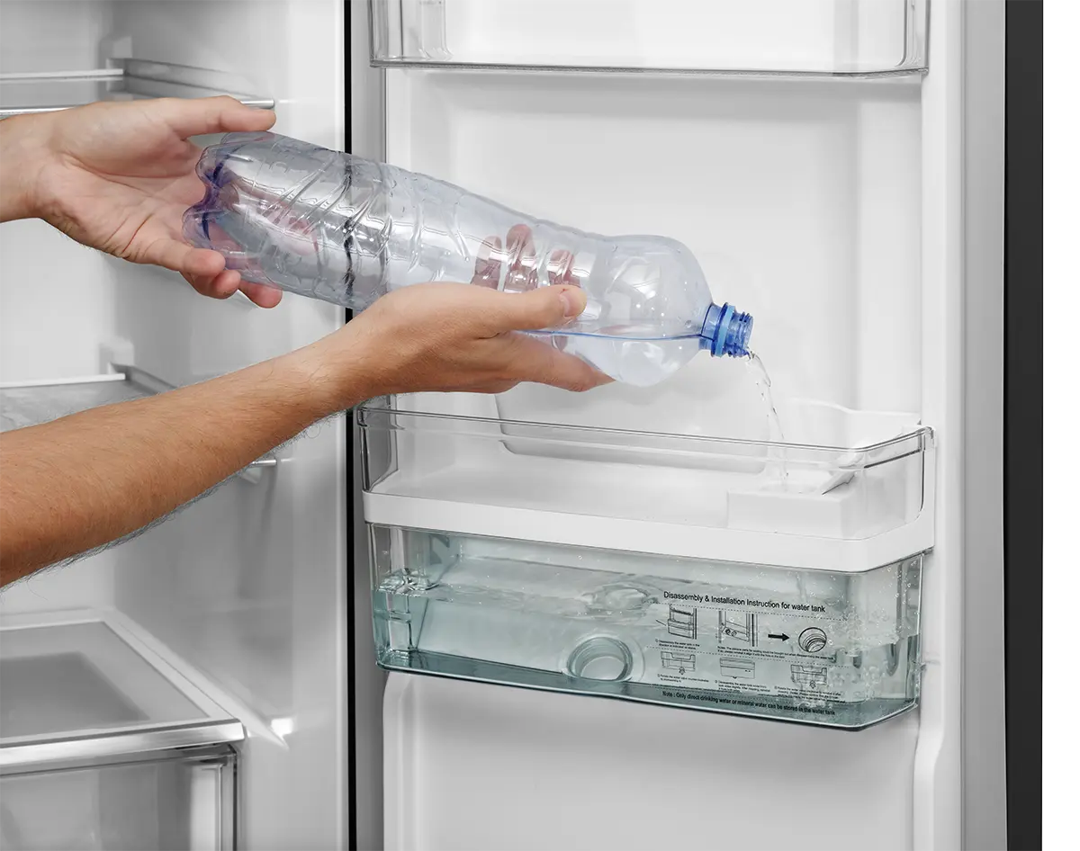 Vďaka zabudovanému dávkovaču na vodu si môžete čapovať sviežu vodu bez nutnosti pripojenia k vodovodnému radu. V dverách chladničky sa nachádza zásobník s objemom 2 l, ktorý zaberá minimum miesta a neznižuje jej úžitkový objem.