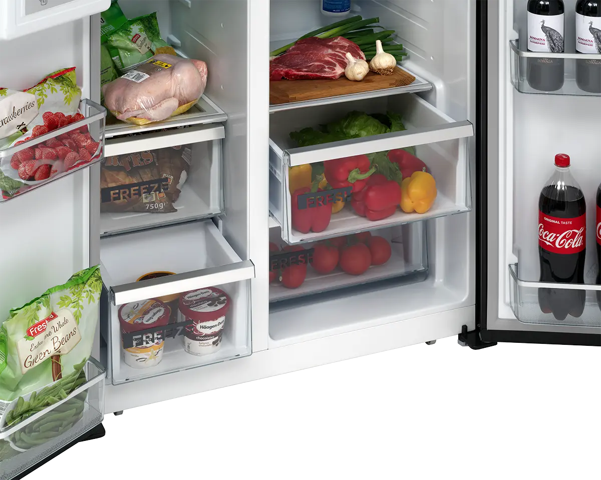 Jednou z hlavných predností chladničiek typu Side by Side je ich veľký objem a prehľadné vnútorné usporiadanie. Model LA7691bc ponúka úložný priestor s celkovým objemom 556 l. Chladnička s kapacitou 372 l a priestorná mraznička s objemom 184 l spĺňa potreby početnej domácnosti.