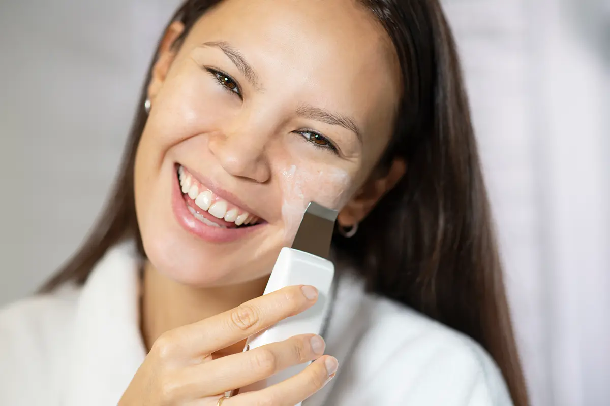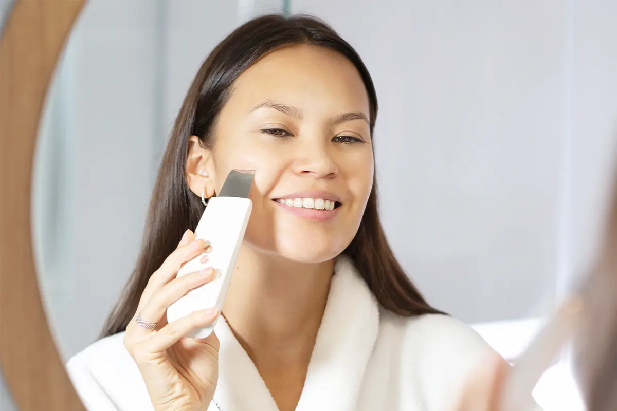 Ultrazvuková špachtľa dokáže odstrániť odumreté kožné bunky, nečistoty aj zvyšky make-upu. Počas režimu čistenia začne aplikačná hlavica vibrovať a rozsvieti sa zelená kontrolka. Používajte na odlíčenú, vlhkú tvár a prístroj držte tak, aby hlavica smerovala hore. Pleť udržujte vlhkú a jemne prechádzajte po tvári. Ultrazvukové vibrácie prispievajú k efektívnemu odstráneniu prebytočného kožného mazu, ktorý býva príčinou vzniku akné a čiernych bodiek. Výsledkom bude hladšia, svieža a zdravšia pleť.