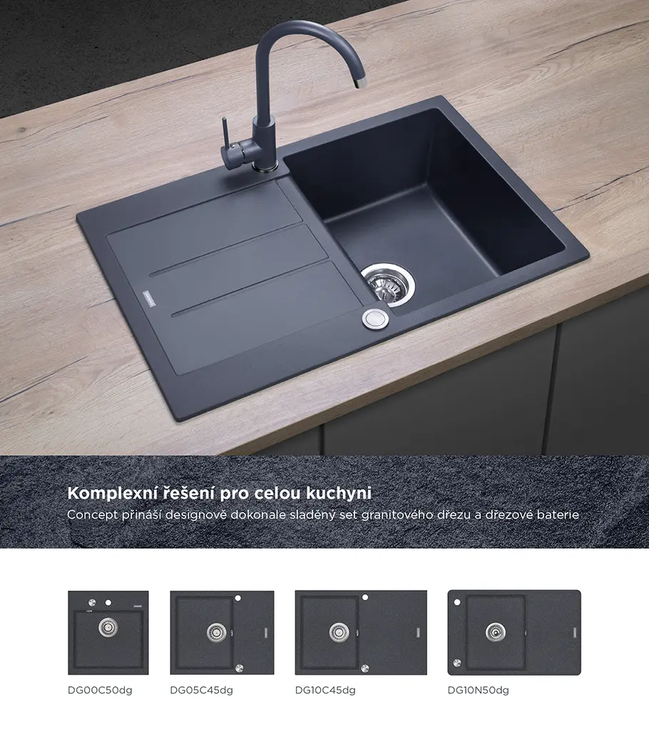 Drezová batéria BDG3334dg je spracovaná v jednoduchom a elegantnom designe. Povrch batérie tvorí kvalitná farba s designom granitového povrchu v kombinácii s lesklými chrómovými detailmi. Dokonale ladí s tmavo šedými granitovými drezmi Concept. Tento model ponúka ďalšie 4 farebné varianty: čierna (BDG3334bc), biela (BDG3334wh), béžová (BDG3334be) a lesklá chrómová (BDC3334).