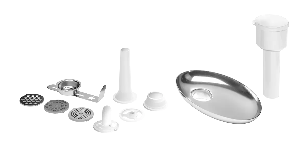 Máte radi domáce hamburgery, čevapčiči alebo lasagne? Výmenné nástavce na mletie mäsa s tromi rôznymi veľkými otvormi vám umožnia namlieť mäso podľa potreby. Husté sitko sa hodí pre prípravu zmesi na paštéty, stredné sitko na sekanú alebo karbonátky. Sitko s najväčšími otvormi môžete využiť napríklad k príprave zmesi na klobásy, ktoré potom jednoducho vytvoríte pomocou špeciálneho nástavca na plnenie párkov a klobás. Praktické je tiež tvorítko na cukrovinky so 4 rôznymi otvormi, vďaka ktorému dosiahnete dokonalých výsledkov za zlomok času.