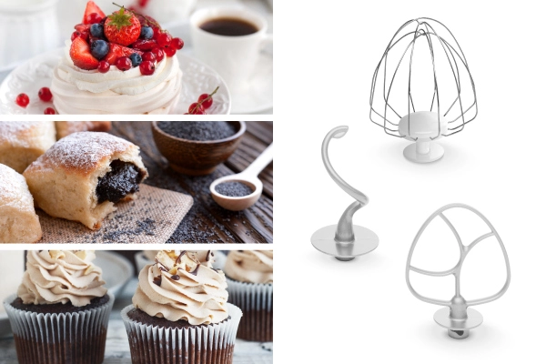 Robot je opatrený troma druhmi metiel, ktoré si ľahko a rýchlo poradia s prípravou najrôznejších ciest i krémov. Balónová metla je ideálna pre šľahanie ľahkých zmesí. Za okamih získate krásne nadýchané krémy, výbornú šľahačku alebo tuhý sneh z bielkov. Hnetací hák si skvelo poradí so spracovaním kysnutých ciest, napr. na koláče, chleba alebo pizzu. Miešacia metla je vhodná na trené cestá alebo maslové krémy.