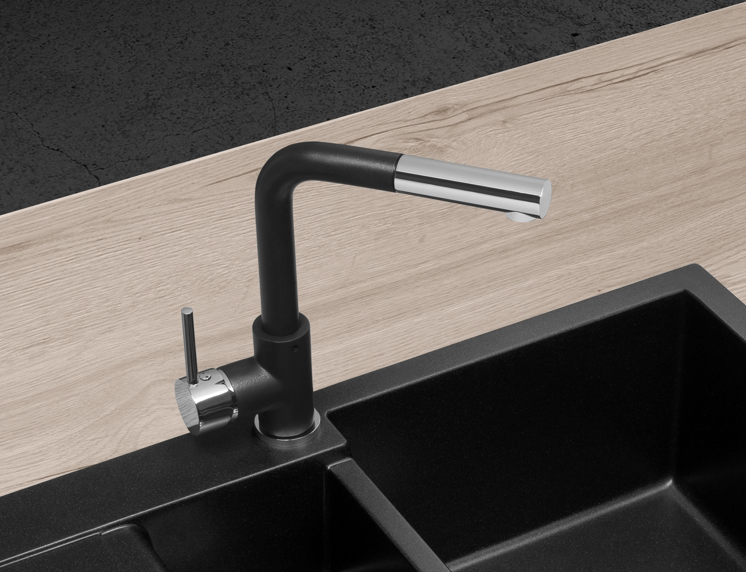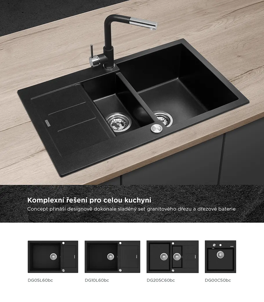 Drezová batéria BDG4527bc je spracovaná v elegantnom, jednoduchom designe v tvare písmena L. Povrch batérie tvorí kvalitná farba s designom granitového povrchu v kombinácii s lesklými chrómovými detailmi. Dokonale ladí s čiernymi granitovými drezmi Concept. Tento model ponúka ďalšie 4 farebné varianty: biela (BDG4527wh), béžová (BDG4527be), tmavo šedá (BDG4527dg) a lesklá chrómová (BDC4527).