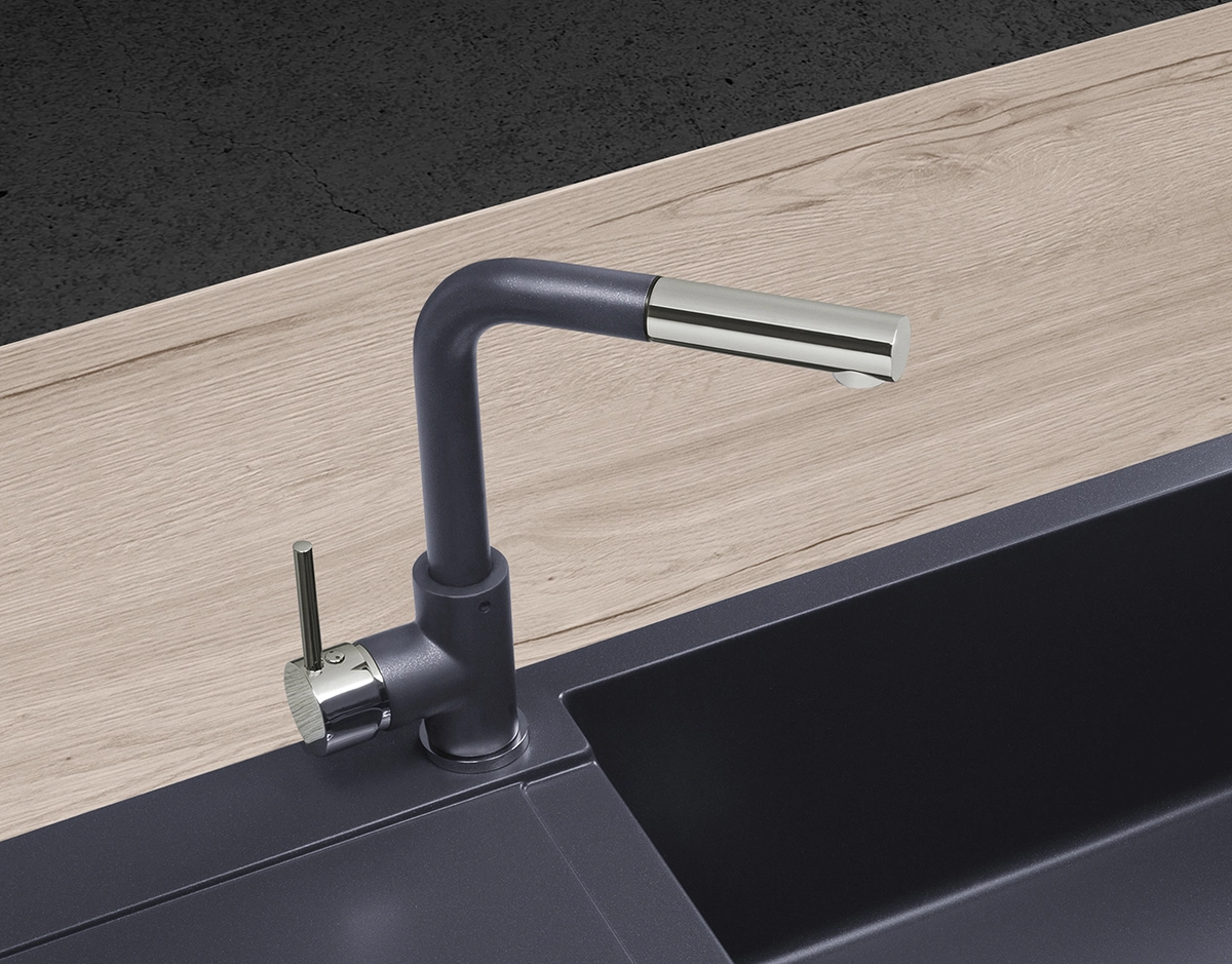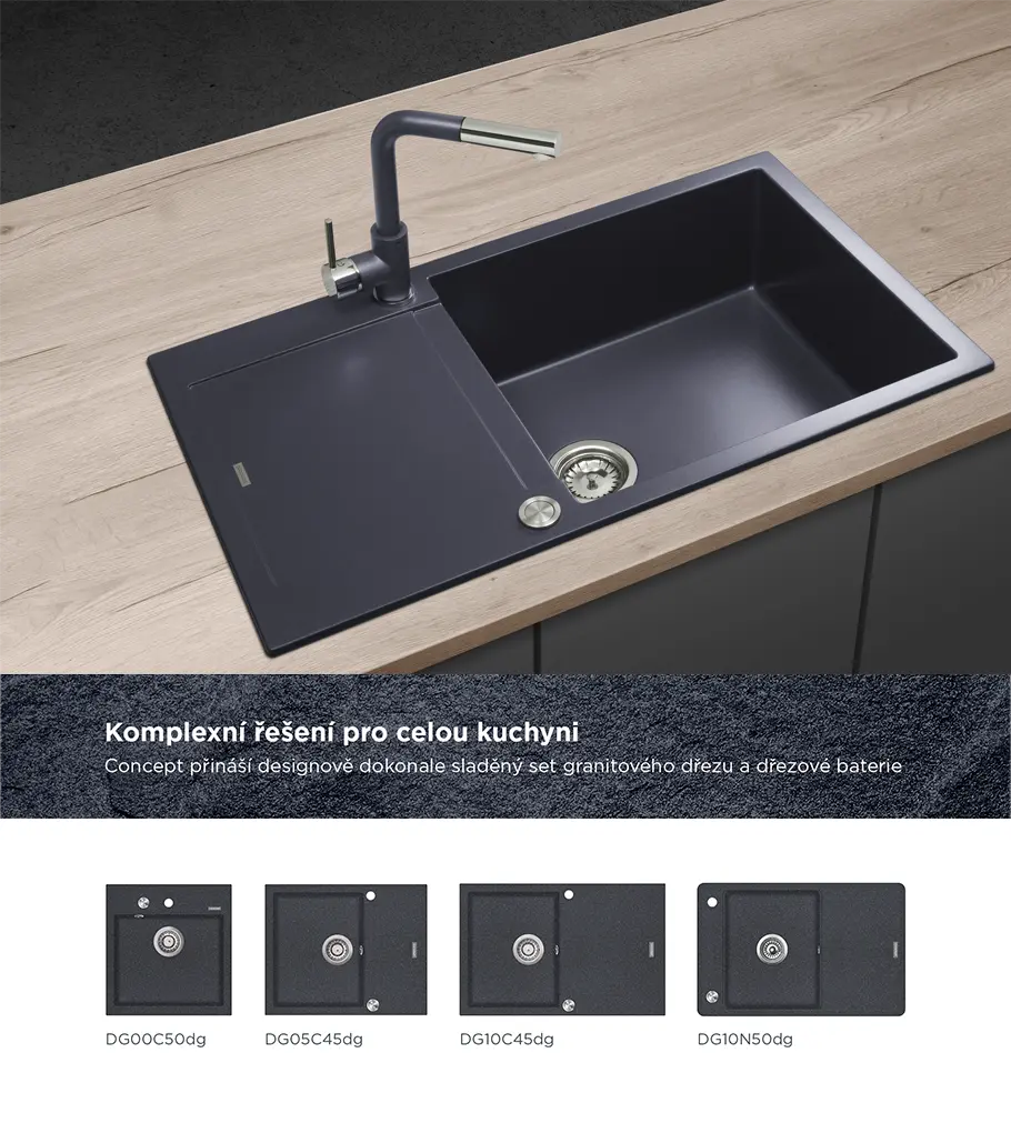 Drezová batéria BDG4527dg je spracovaná v elegantnom, jednoduchom designe v tvare písmena L. Povrch batérie tvorí kvalitná farba s designom granitového povrchu v kombinácii s lesklými chrómovými detailami. Dokonale ladí s tmavo šedými granitovými drezmi Concept. Tento model ponúka ďalšie 4 farebné varianty: biela (BDG4527wh), čierna (BDG4527bc), béžová (BDG4527be) a lesklá chrómová (BDC4527).