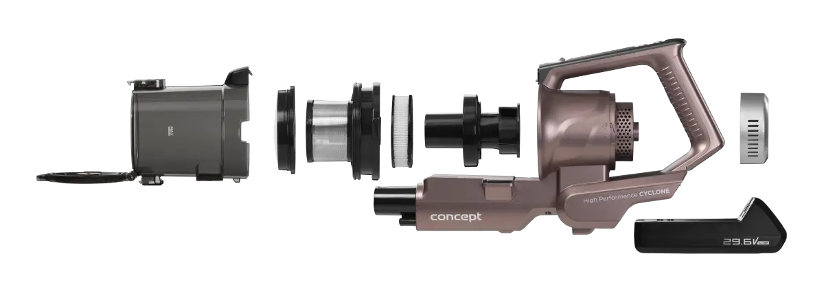 Prachová nádoba disponuje objemom 0,5 l a jej čistenie je veľmi rýchle. Po jej naplnení stačí jednoducho stlačiť tlačidlo pre uvoľnenie, nádobu vybrať z tela vysávača, otvoriť a vysypať. Vďaka kvalitnému HEPA filtru 13 je vysávač vhodný aj pre alergikov. Pre zachovanie vysokej účinnosti vysávania odporúčame všetky kefy pravidelne kontrolovať a čistiť.