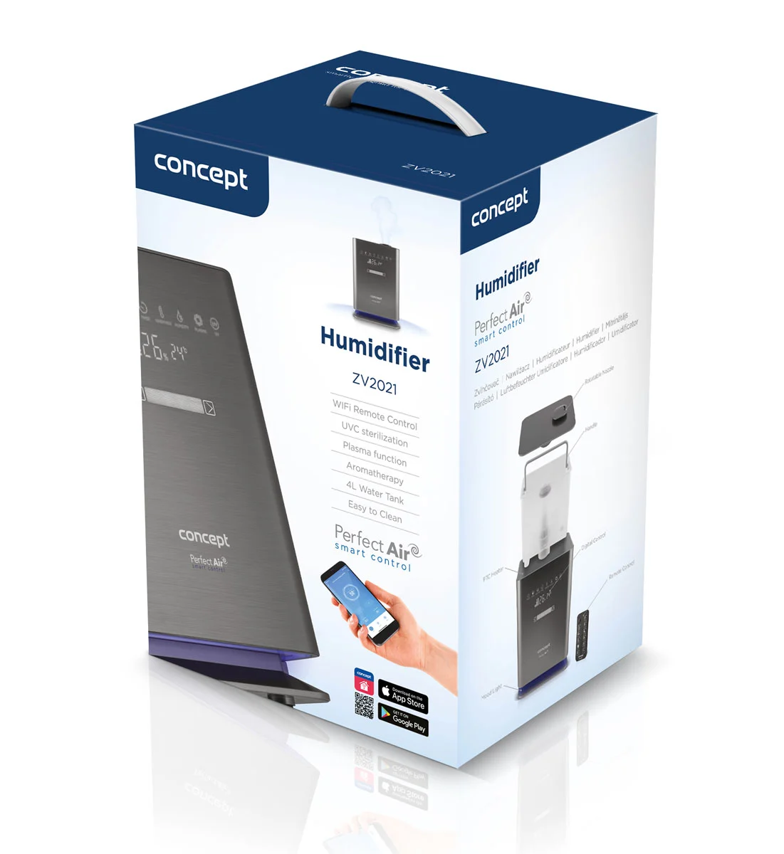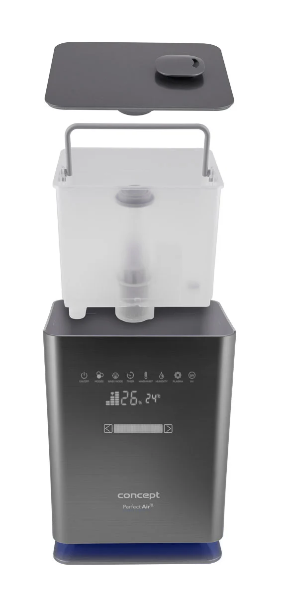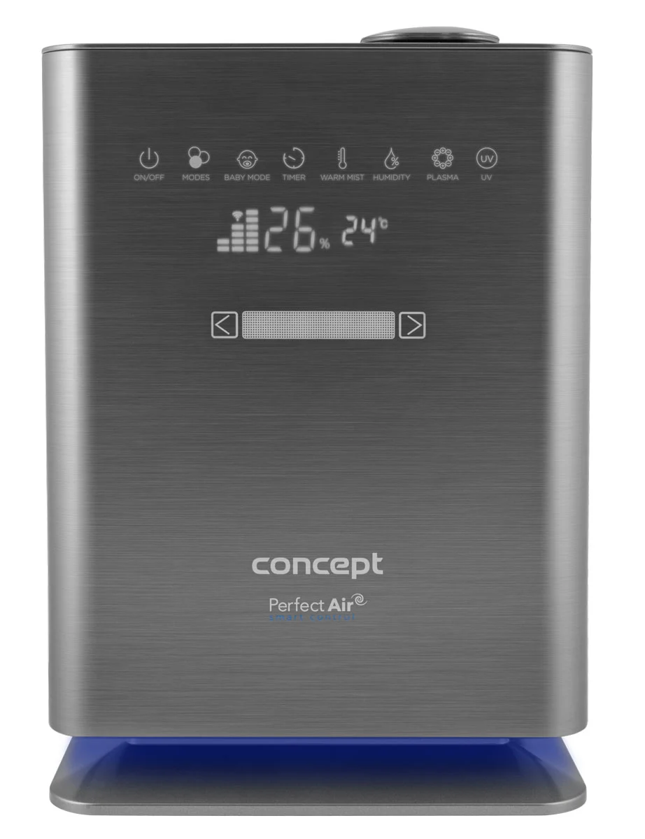 Zvlhčovač je opatrený prehľadným dotykovým LED displejom, ktorý ukazuje aktuálnu vlhkosť a teplotu v miestnosti a upozorní vás na nedostatok vody v zásobníku. Vyberať môžete z emisie studenej alebo teplej pary, a podľa potreby regulovať rýchlosť jej prúdenia a intenzitu vlhkosti. Jednoducho aktivujete akýkoľvek režim vrátane časovača s nastavením až na 12 h. Vďaka mobilnej aplikácii Concept Home, ktorá je zdarma dostupná pre iOS i Android, môžete zvlhčovač ovládať odkiaľkoľvek a kedykoľvek mať prehľad o aktuálnom stave ovzdušia v miestnosti. Využiť môžete tiež diaľkový ovládač.