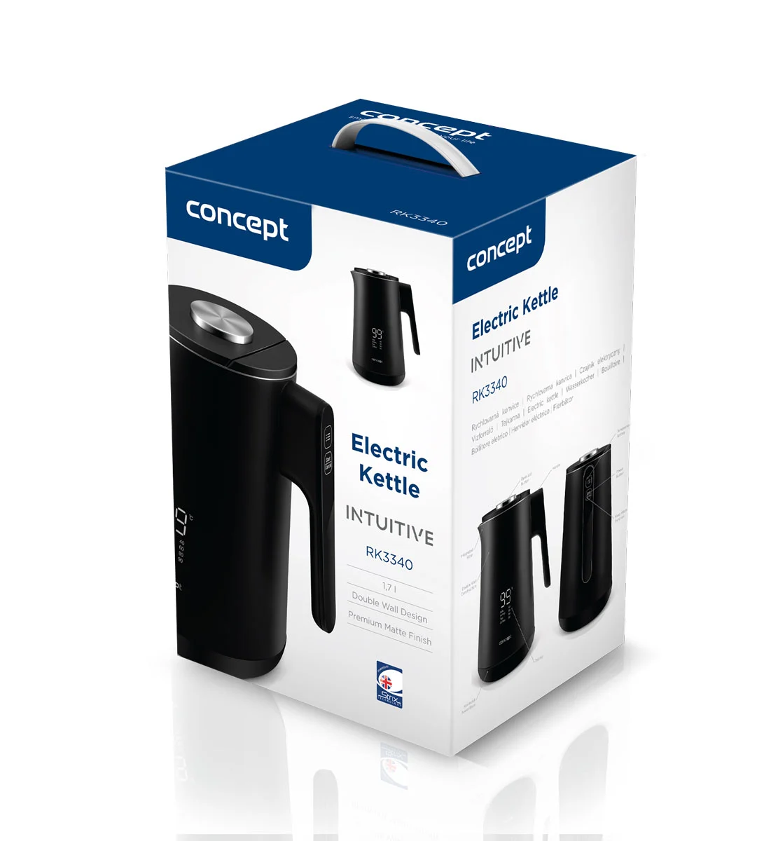 Rýchlovarná kanvica RK3340 Intuitive s objemom 1,7 l prepája modernú technológiu a užitočné funkcie. Vyniká atraktívnym designom, ktorý podčiarkuje elegantné dvojplášťové prevedenie a prehľadný digitálny displej umiestnený na tele kanvice.