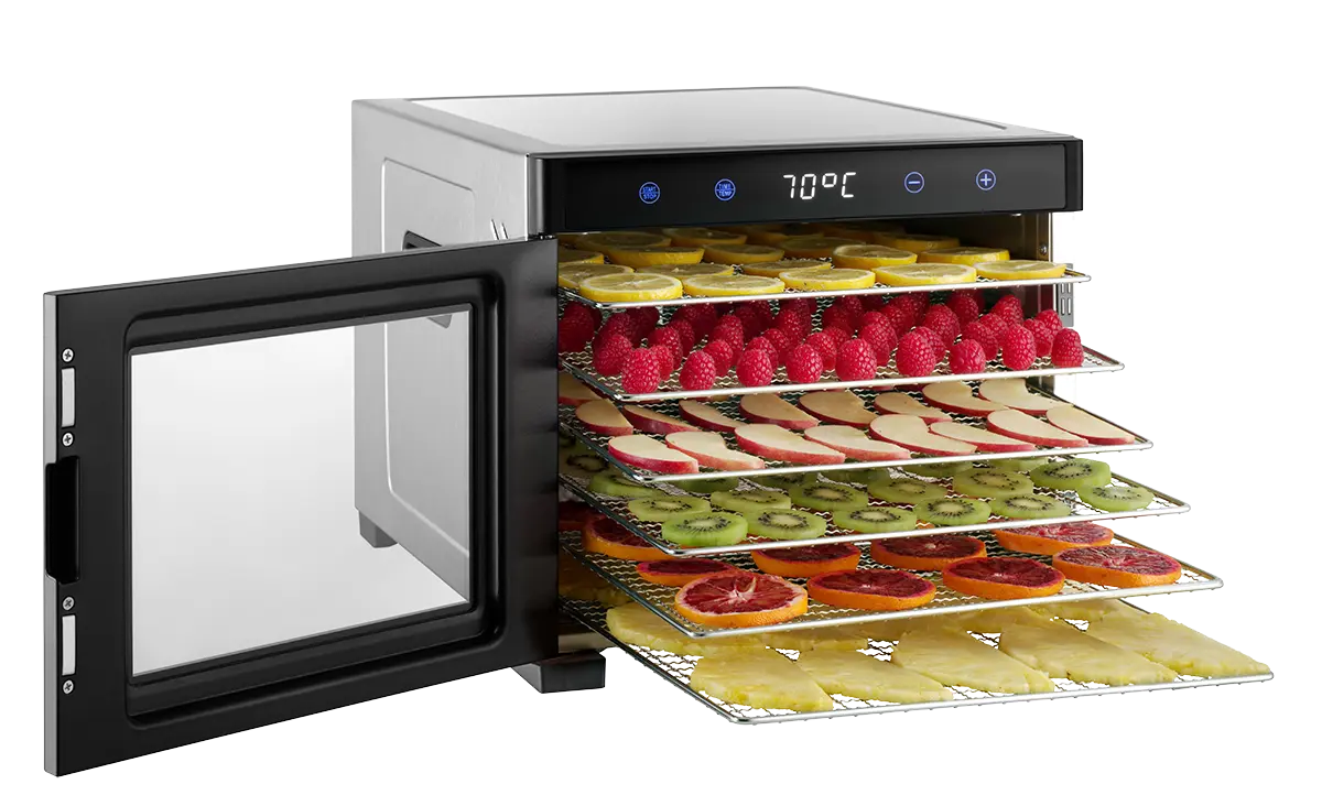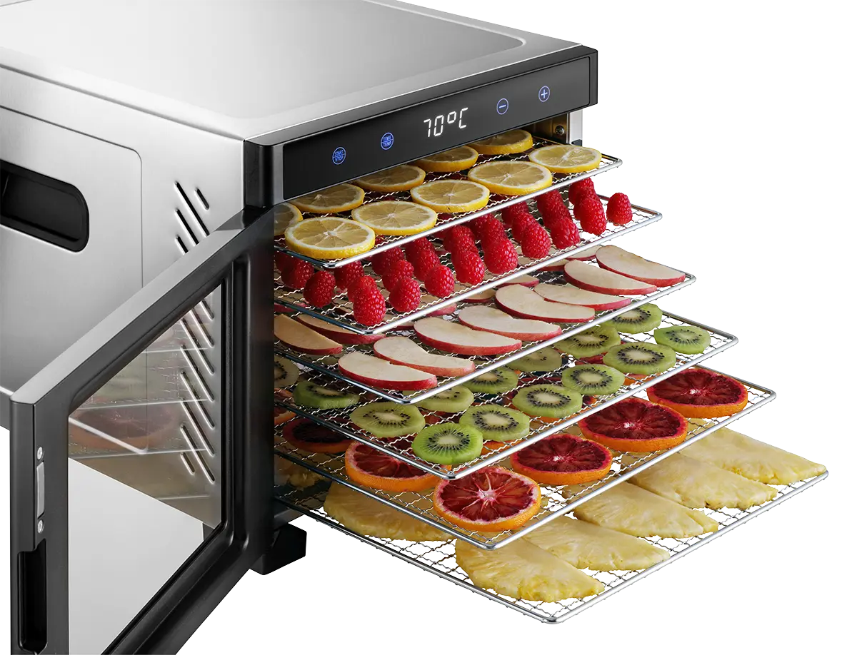Sušička SO2000 disponuje horizontálnym prúdením vzduchu, vďaka ktorému dochádza k rovnomernému sušeniu. Je vybavená 6 nerezovými sušiacimi plátmi, ich výhodou je, že sa nahrievajú a tým urýchľujú proces sušenia. Zároveň sú odolnejšie oproti plátom plastovým. Praktický je tiež výsuvný systém, vďaka ktorému budete mať lepší prehľad o priebehu sušenia. Už nemusíte rozoberať celú sušičku, aby ste skontrolovali aj spodné poschodia.