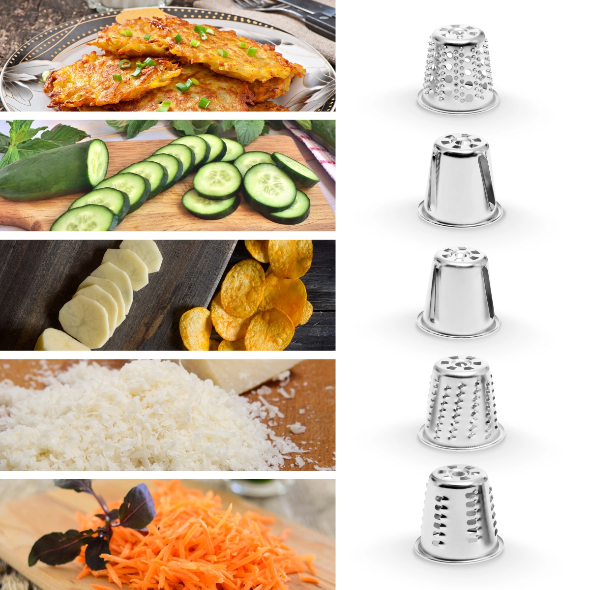 Potrebujete nastrúhať zeleninu alebo ovocie na váš obľúbený šalát, syr na cestoviny alebo spotrebovať staré pečivo na strúhanku? S robotom RM7510 to zvládnete raz dva. Stačí si len vybrať ten správny nástavec podľa hrubosti strúhania a môžete začať.