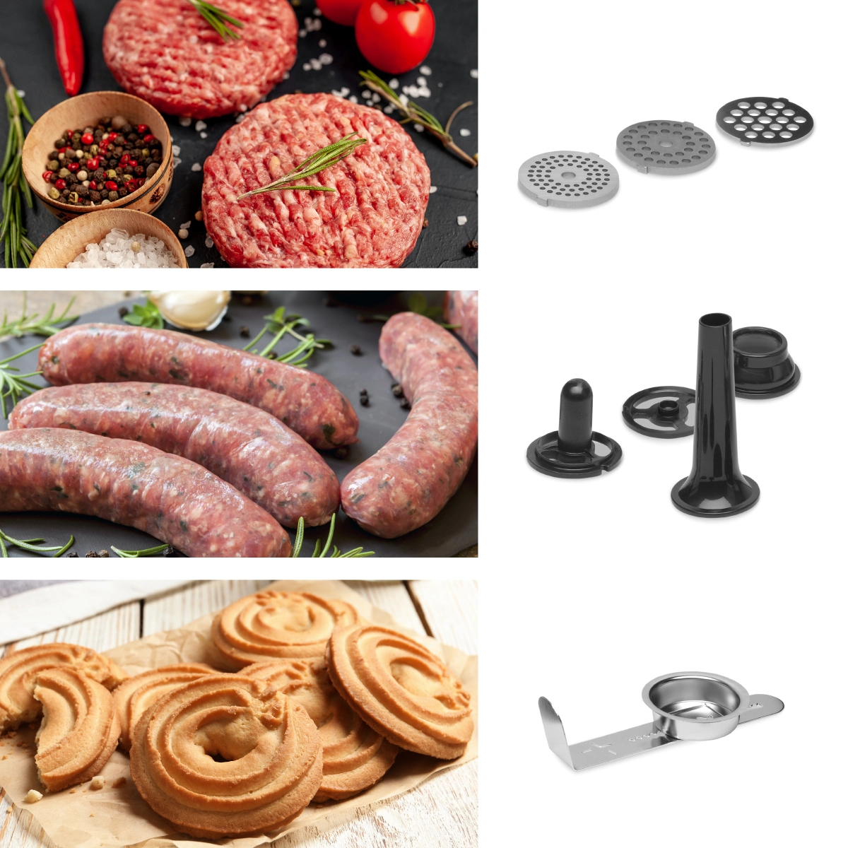 Máte radšej domáce hamburgery, čevapčiči alebo lasagne? Výmenné nástavce na mletie mäsa s tromi rôzne veľkými otvormi vám umožnia namlieť mäso podľa potreby. Husté sitko sa hodí pre prípravu zmesi na paštéty, stredné sitko na sekanú alebo karbonátky. Sitko s najväčšími otvormi môžete využiť napríklad k príprave zmesi na klobásy, ktoré potom jednoducho vytvoríte pomocou špeciálneho nástavca na plnenie párkov a klobás.