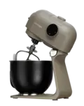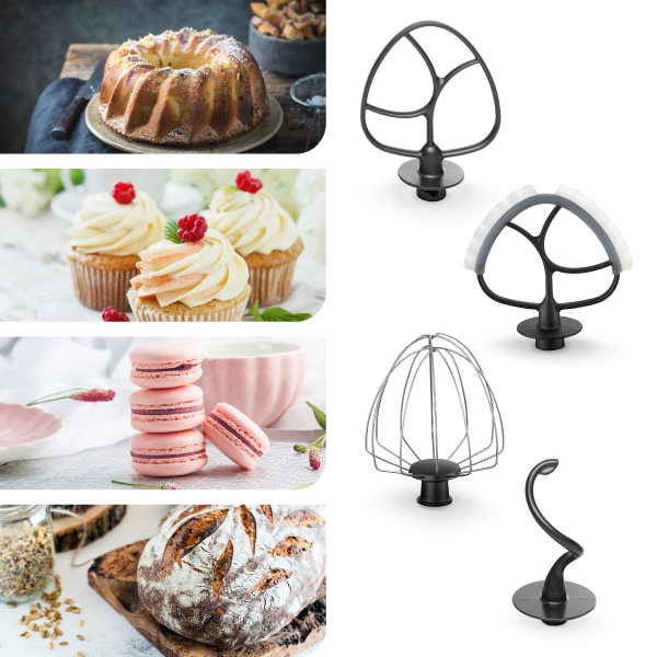 Robot je opatrený štyrmi druhy celokovových metiel. Miešacia metla je vhodná na trené a iné stredne ťažké cestá. Flexi metlu oceníte pri príprave ľahkých krémov, náplní a poliev. Vďaka gumovej stierke dokonale kopíruje misu a perfektne stiera zmes zo stien. Šľahacia metla je ideálna na šľahanie vajec, bielkov, šľahačky, ľahkých krémov, majonézy i omáčok. Hnetací hák si skvele poradí so spracovaním kysnutých ciest, napr. na buchty, chlieb alebo pizzu. Súčasťou robota je aj 5 litrová nerezová misa s praktickým držadlom a vekom.