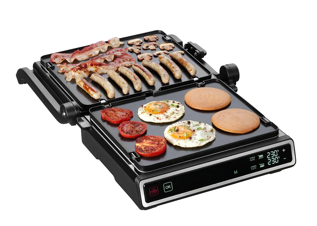 Kontaktný gril GE3550 ponúka jednoduché ovládanie pomocou 11 automatických programov vrátane manuálneho režimu DIY. Stačí vložiť suroviny, zvoliť správny program a gril si sám nastaví vhodnú teplotu a čas prípravy. Vychutnať si môžete dokonale prepečené steaky, slaninu, hydinu, ryby, zeleninu, sendviče alebo vafle. Nastavené hodnoty môžete sledovať na prehľadnom digitálnom displeji.