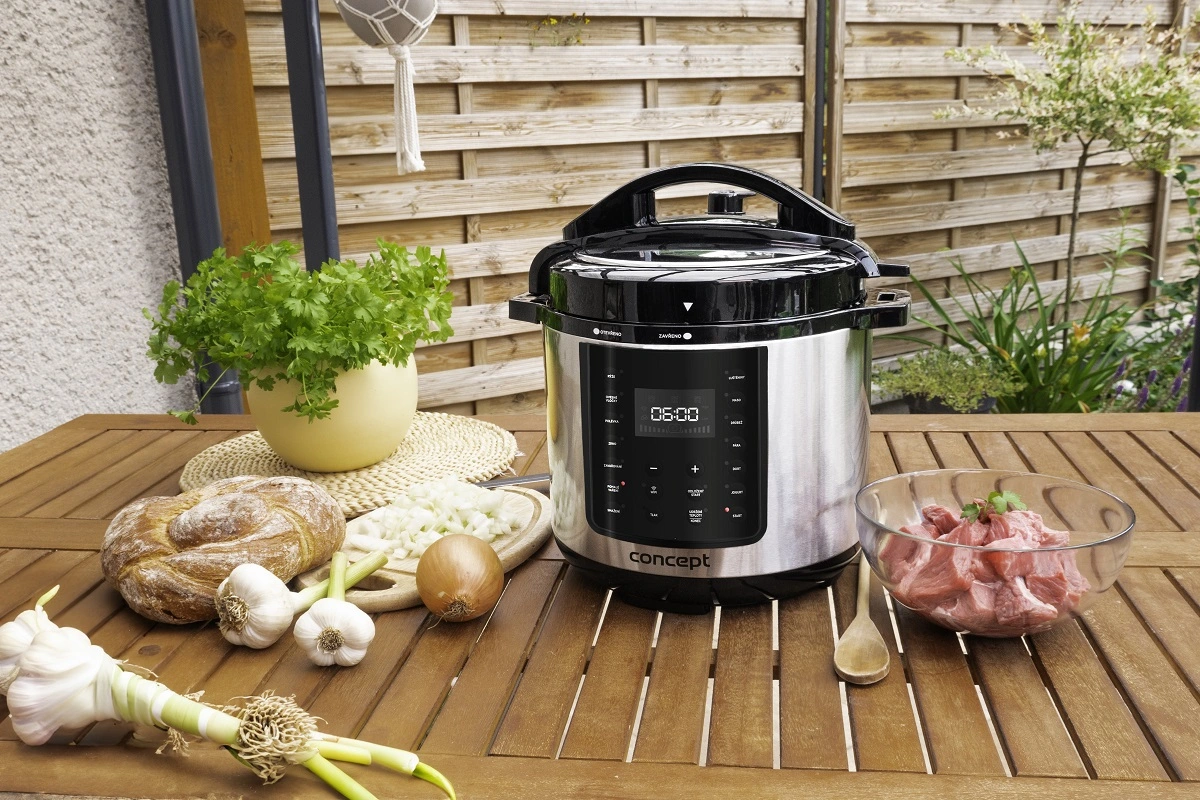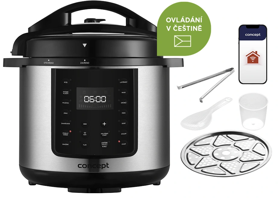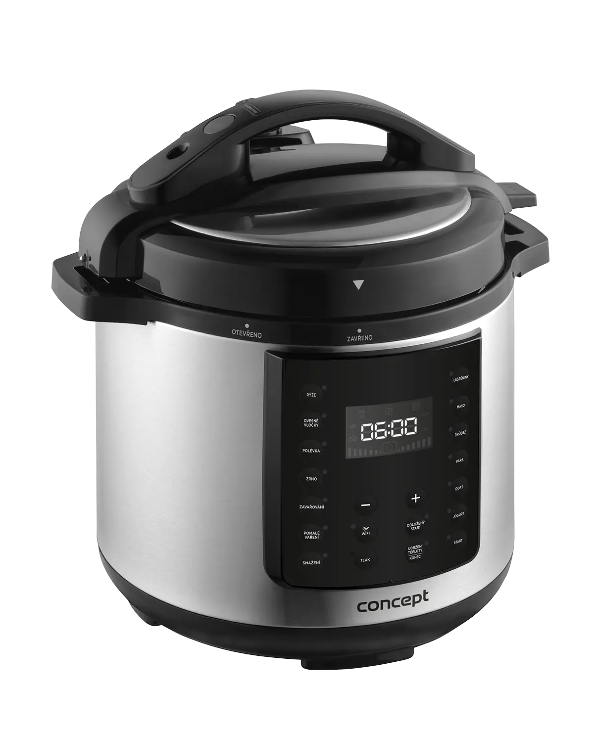 Multifunkčný tlakový hrniec Concept CK8001 s WiFi pripojením predstavuje moderný spôsob varenia. S objemom 5,6 l s ním pohodlne uvaríte jedlo až pre 6 osôb, takže zasýti aj veľkú rodinu. Zastane prácu tlakového, parného, pomalého, zaváracieho i sous-vide hrnca, ryžovaru, polievkovaru a jogurtovača. S CK8001 pripravíte ľahko a rýchlo takmer čokoľvek, na čo si spomeniete - od polievky až po sladký dezert.