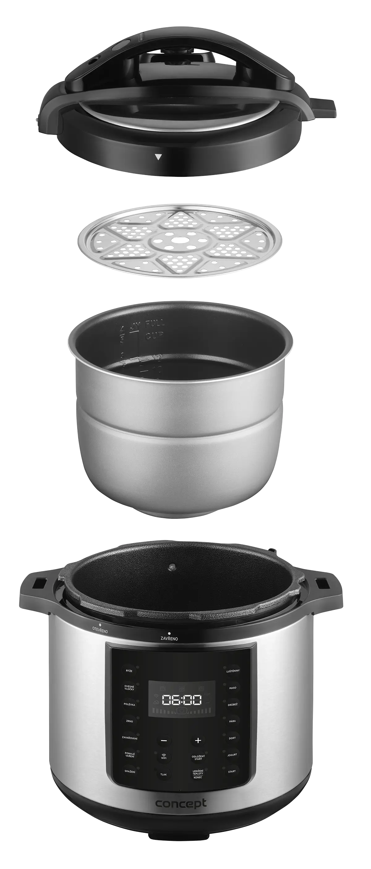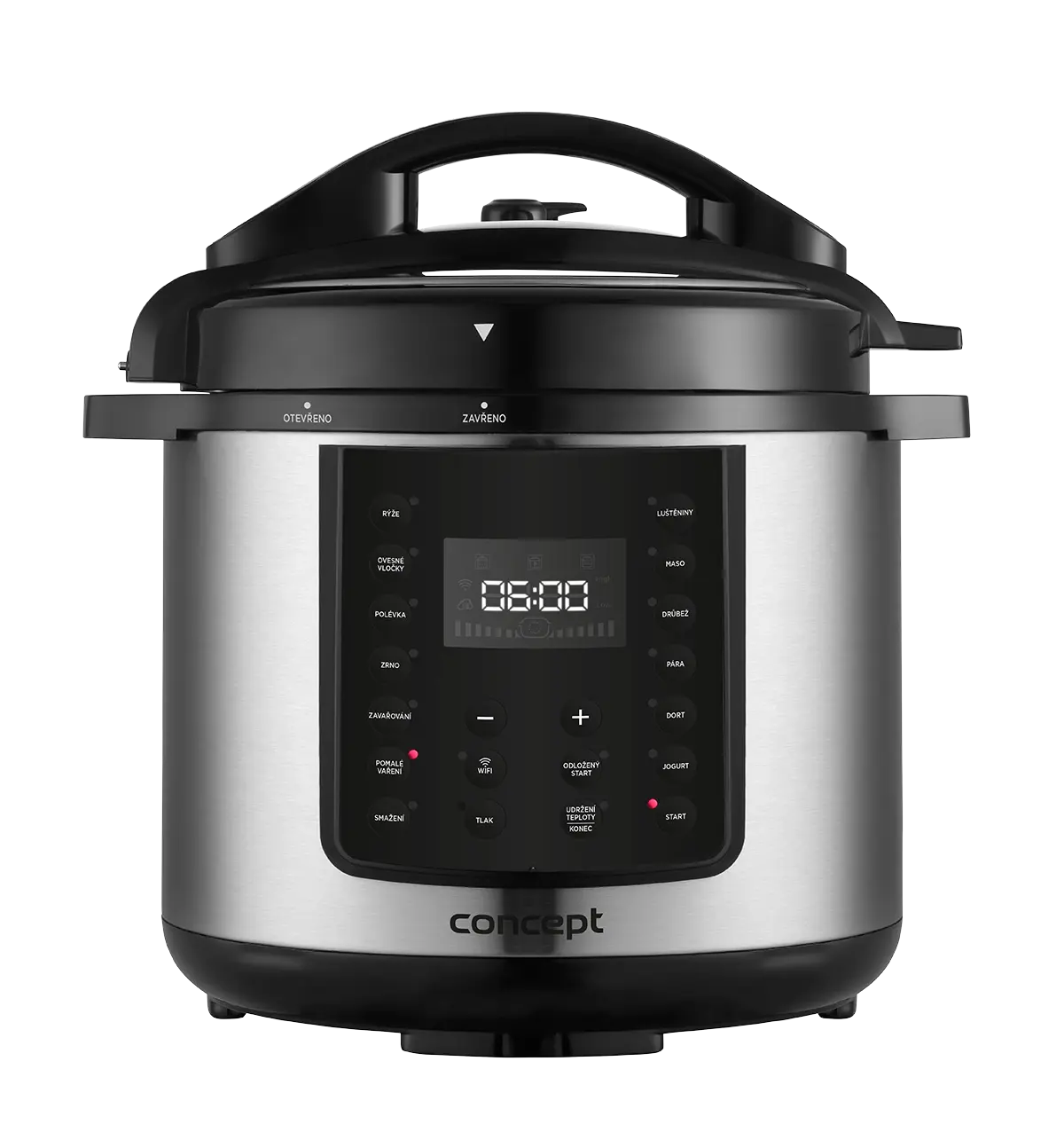 Multifunkčný tlakový hrniec Concept CK8001 je vybavený prehľadným digitálnym panelom v češtine, takže jeho ovládanie je veľmi jednoduché a intuitívne. Vyberať môžete z 13 prednastavených programov: ryža, ovsené vločky, polievka, zrno, zaváranie, pomalé varenie, vyprážanie, strukoviny, mäso, hydina, para, torta a jogurt. Pri jednotlivých programoch môžete podľa potreby upraviť nastavenie tlaku a dobu varenia. Na displeji môžete sledovať zostávajúci čas prípravy. Po ukončení programu sa hrniec automaticky prepne do režimu Keep Warm, v ktorom uchová uvarený pokrm teplý do okamihu servírovania.