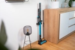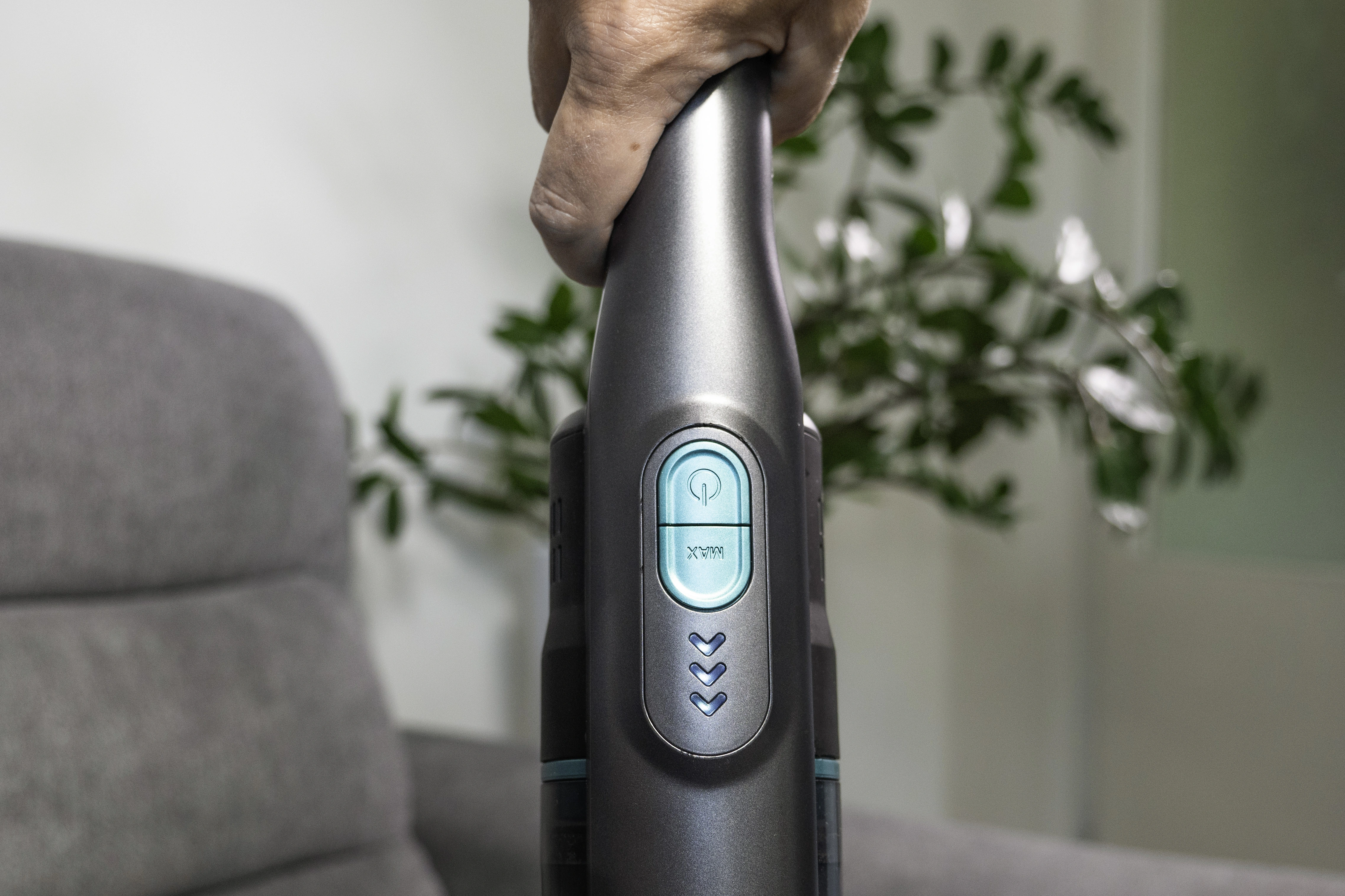 Vysávač je osadený dobíjacou Li-Ion batériou s kapacitou 2200 mAh, ktorá mu dáva maximálnu voľnosť pohybu. K vysávaniu môžete voliť z dvoch stupňov výkonu. Po spustení vysávač pracuje v základnom režime, ktorý je vhodný na bežné upratovanie tvrdých podláh. Sacia sila dosahuje 10 kPa a výdrž na jedno nabitie až 30 minút. Ak potrebujete povysávať väčšie množstvo nečistôt, môžete využiť režim MAX so sacou silou 20 kPa. Pri použití maximálneho výkonu sa prevádzková doba vysávača skracuje. O aktuálnom stave batérie vás informujú 3 svetelné kontrolky umiestnené pod ovládacími tlačidlami.
