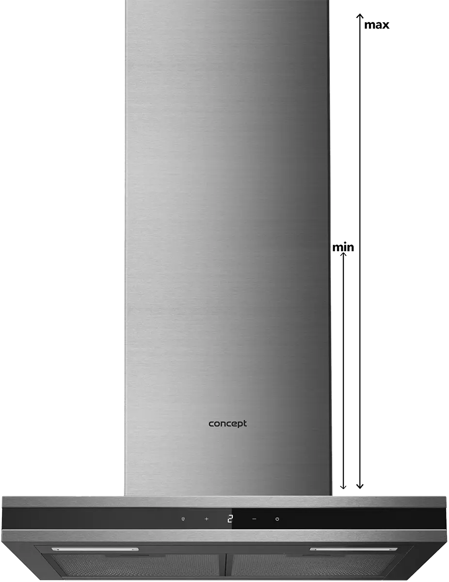 Výška odsávača je spravidla udávaná v minimálnych a maximálnych hodnotách. V balení sú k dispozícii dva komíny, ktoré do seba zapadajú, takže si výšku môžete nastaviť presne podľa svojich potrieb.
