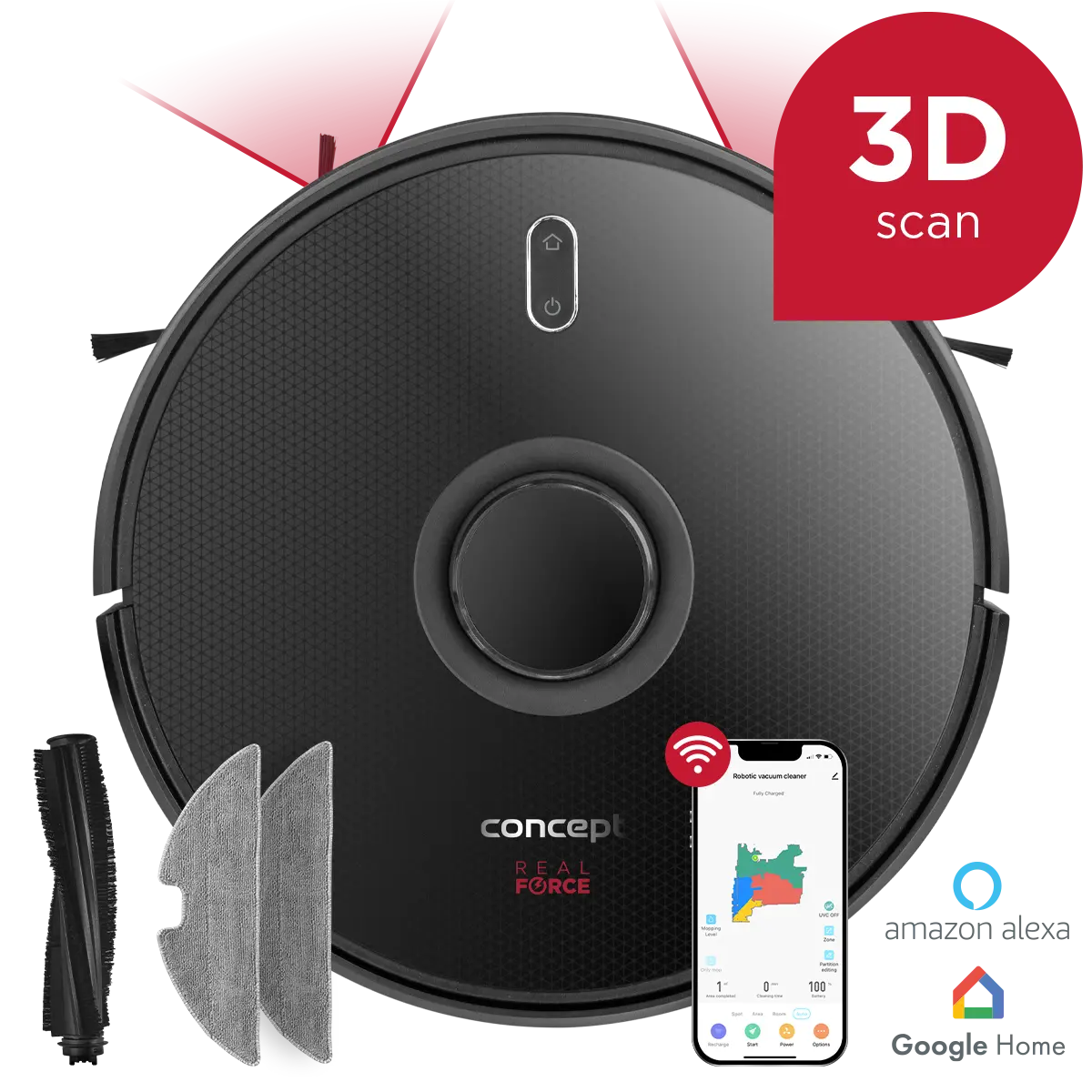3D robotický vysávač Concept VR3400 podporuje ovládanie prostredníctvom hlasového asistenta Amazon Alexa alebo Google Home . Môžete ho teda zapojiť do svojej chytrej domácnosti a ovládať hlasovými povelmi.