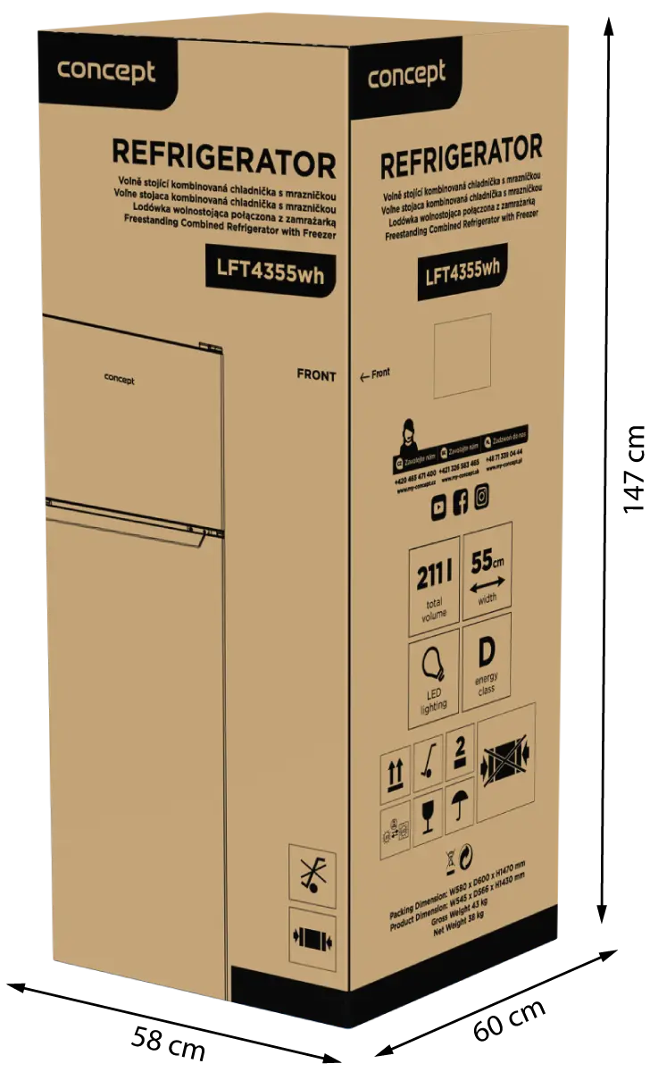 Úzka a úsporná chladnička s mrazničkou Concept LFT4355bc s objemom 211 l je ideálnou voľbou do menších kuchýň. Vyniká nízkou spotrebou, tichou prevádzkou a univerzálnym, stranovo zameniteľným otváraním dverí.