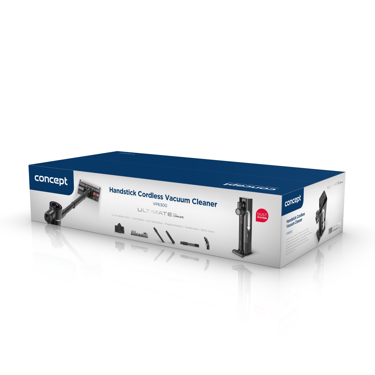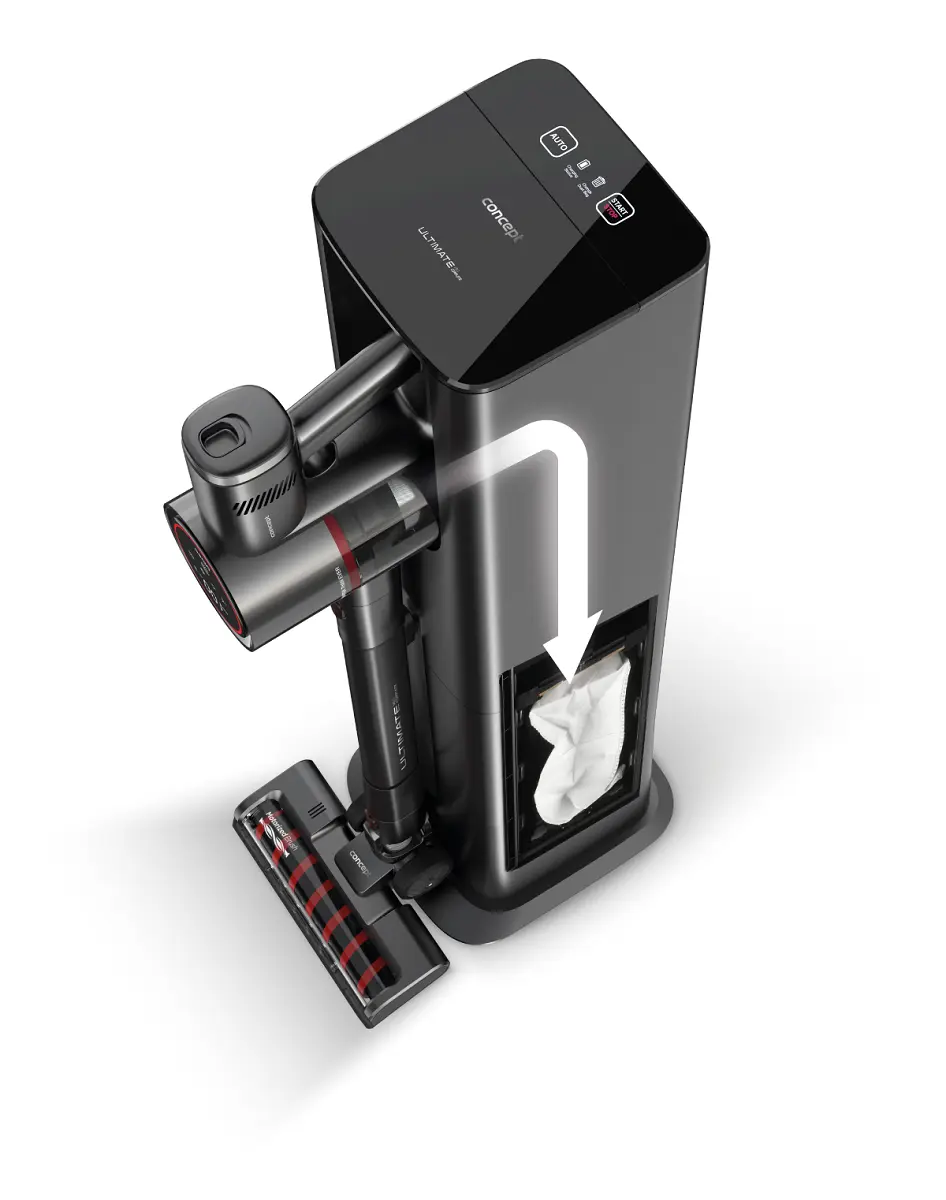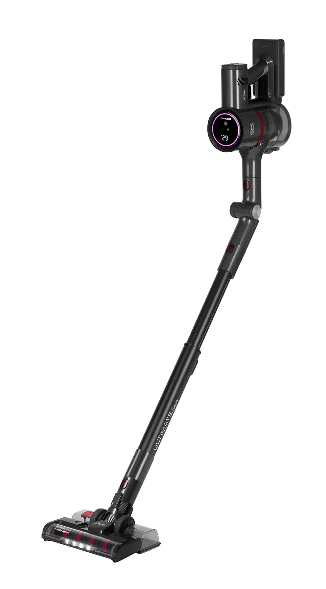 Tyčový vysávač 3 v 1 Ultimate Light Complete 25,9 V Concept VP6310 s multifunkčnou stanicou s automatickým vysypávaním nečistôt, extra sacou silou 26 kPa a dlhou dobou vysávania až 50 min. Disponuje teleskopickou predlžovacou rúrkou, odnímateľnou Li-Ion batériou, kefou na tvrdé podlahy a koberce,