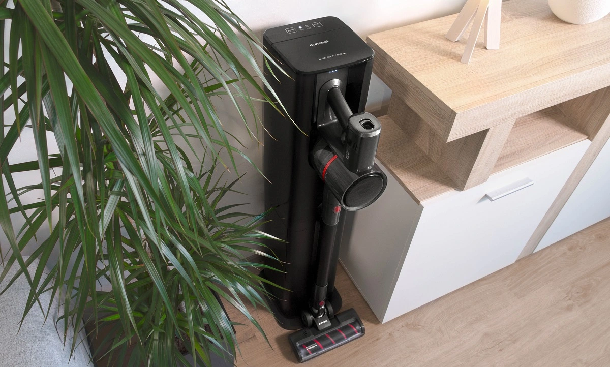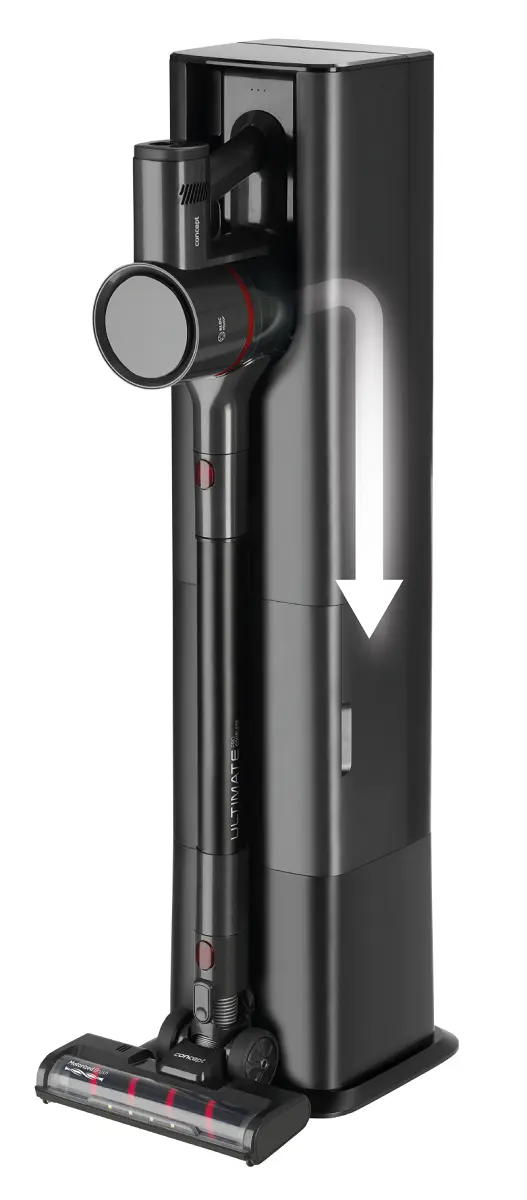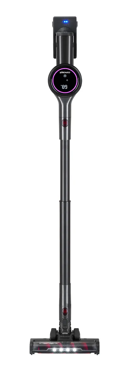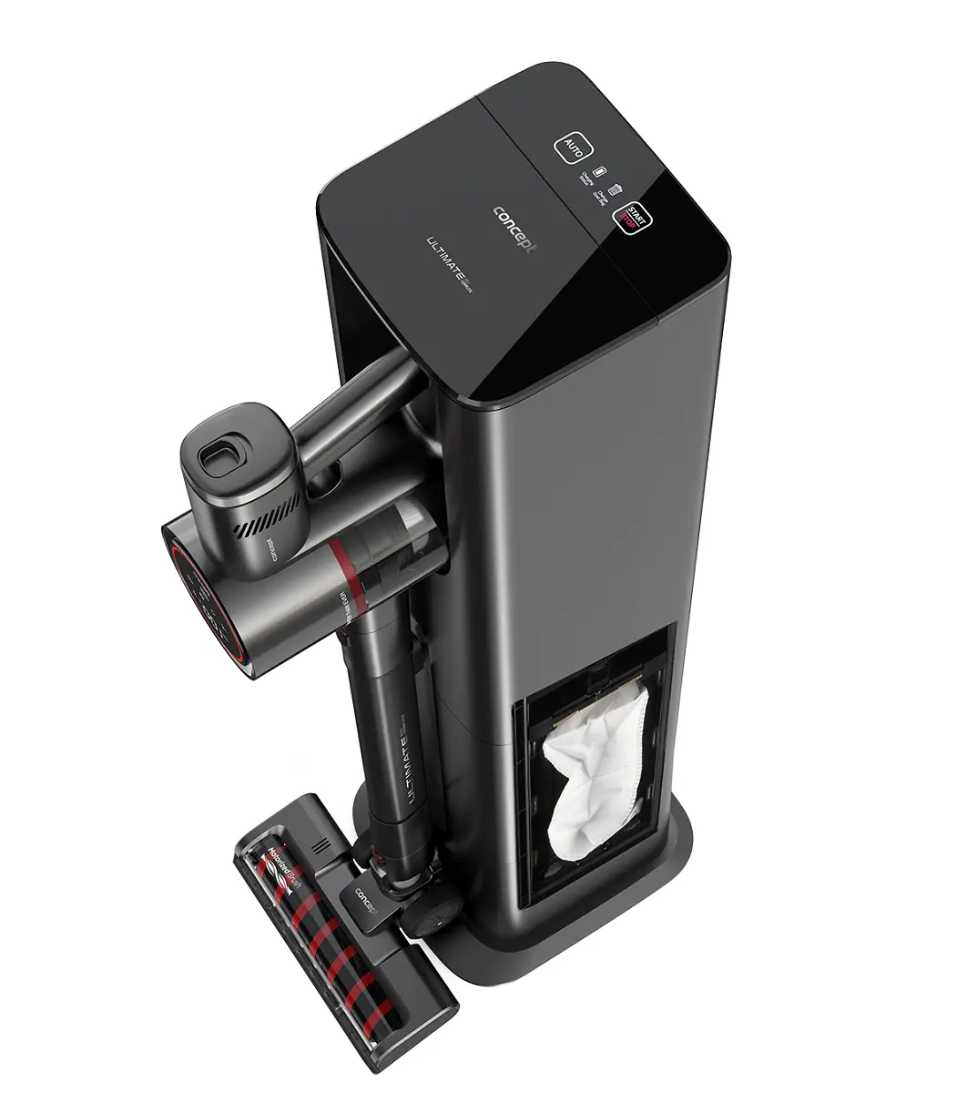 Tyčový vysávač 3 v 1 Ultimate Light Complete 25,9 V Concept VP6310 s multifunkčnou stanicou s automatickým vysypávaním nečistôt, extra sacou silou 26 kPa a dlhou dobou vysávania až 50 min. Disponuje teleskopickou predlžovacou rúrkou, odnímateľnou Li-Ion batériou, kefou na tvrdé podlahy a koberce,