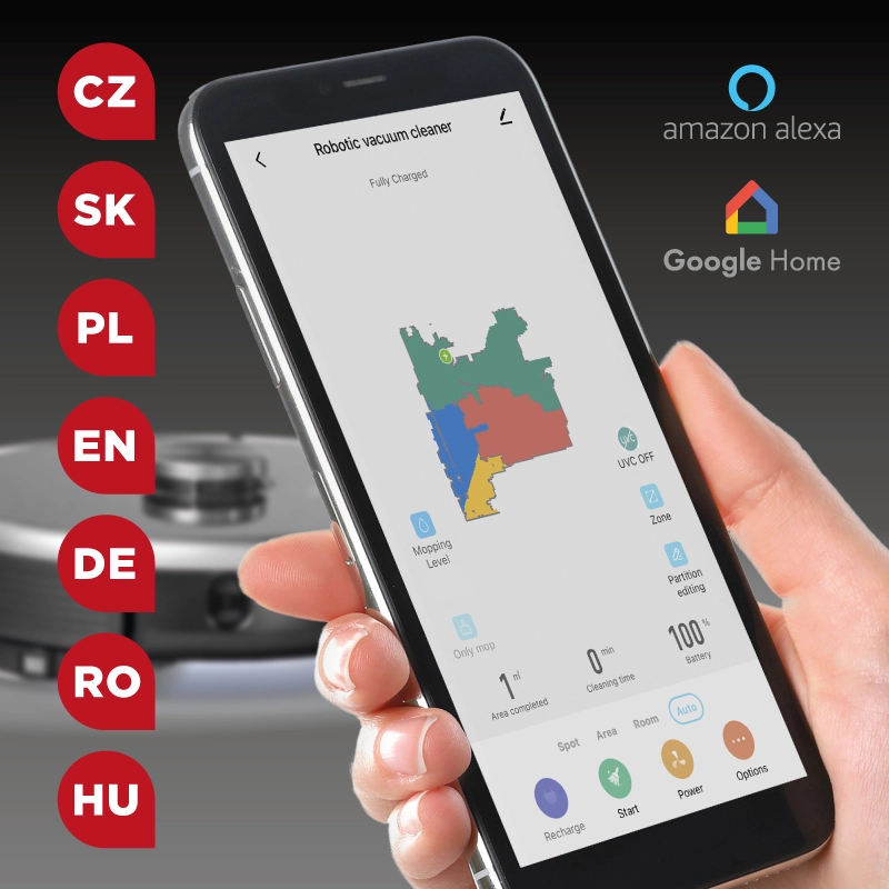 Robot je možné ovládať cez aplikáciu Concept Home, ktorá je v slovenčine a zdarma dostupná pre iOS a Android. Pomocou aplikácie môžete naplánovať upratovanie a v reálnom čase sledovať, koľko toho upratal a kde sa práve nachádza. Aj keď nebudete práve doma, upratovanie domácnosti budete mať neustále pod kontrolou. V aplikácii môžete nastaviť tie jazyk, v ktorom na vás bude robot hovoriť, vrátane češtiny. Cez domáceho asistenta Alexu alebo Google Home môžete vysávač ovládať aj hlasom. A pokiaľ nie ste fanúšikmi moderných technológií alebo nemáte šikovný telefón, môžete ho plne ovládať tiež pomocou diaľkového ovládača.
