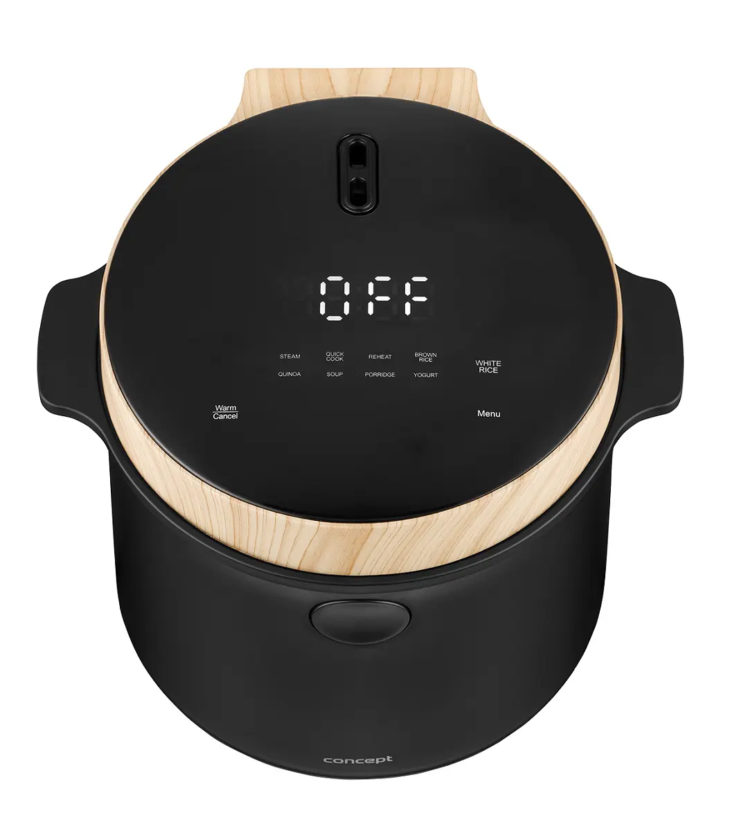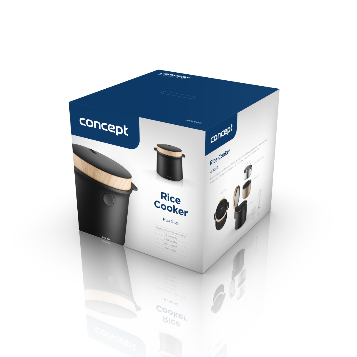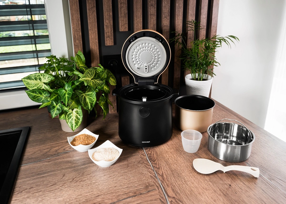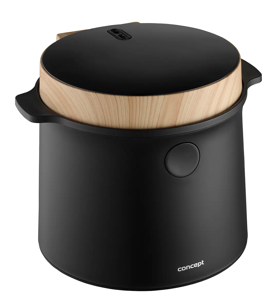Ryžovar Concept RE4040 kombinuje praktické funkcie so štýlovým vzhľadom, ktorý sa hodí do akejkoľvek kuchyne. Jeho elegantný čierny dizajn s drevenými prvkami perfektne doplní moderný interiér. Vďaka kompaktným rozmerom sa ľahko umiestni na kuchynskú linku alebo do skrinky bez toho, aby zaberal príliš veľa miesta. Navyše je ľahký a ľahko prenosný, takže si ho môžete vziať na chalupu alebo na akékoľvek iné miesto, kde ho budete potrebovať.