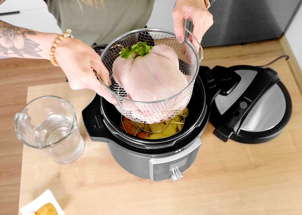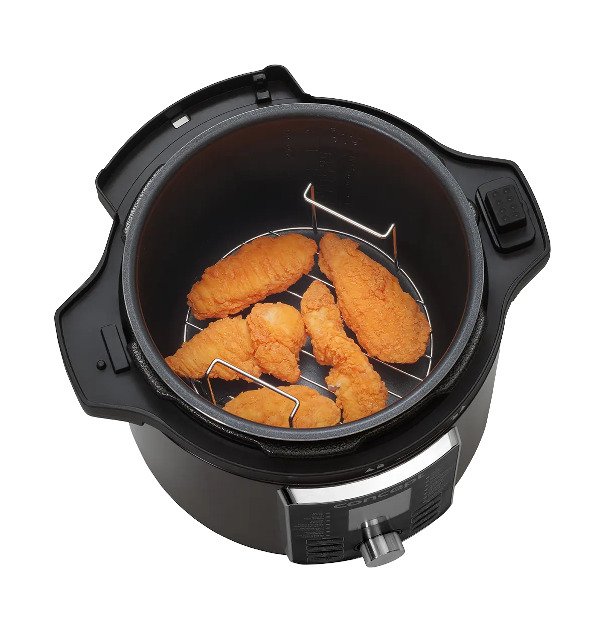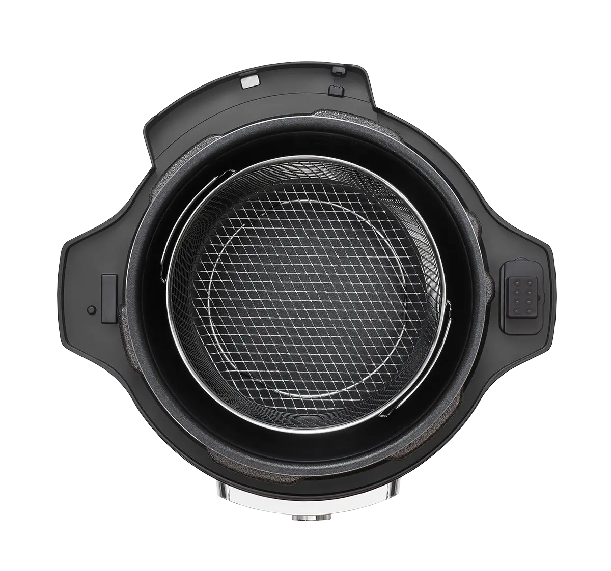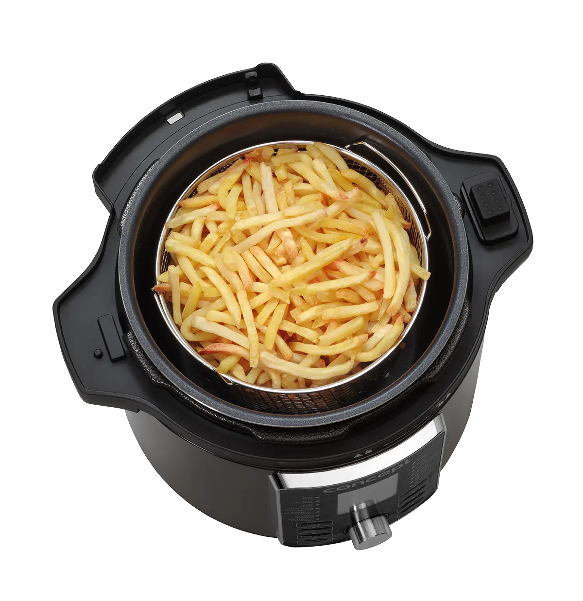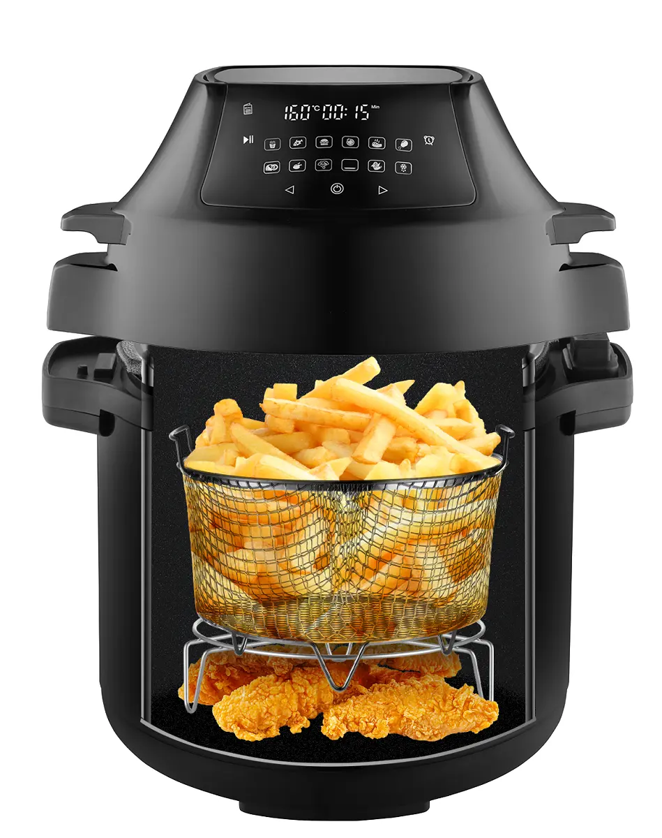Multifunkčný tlakový hrniec s teplovzdušnou pokrievkou a 3,5 l fritovacím košom vám plnohodnotne nahradí teplovzdušnú fritézu. Ponúka 12 prednastavených programov (zmrazené hranolky, ryby, hamburger, pizza, hovädzí steak, kuracie stehná, hranolky zo surových zemiakov, celé kura, sušenie, grilovanie, zelenina, rozmrazovanie) a možnosť regulácie času a teploty v rozmedzí od 80 do 200 °C. Ovláda sa pomocou dotykového panelu umiestneného priamo na Air fry pokrievke.