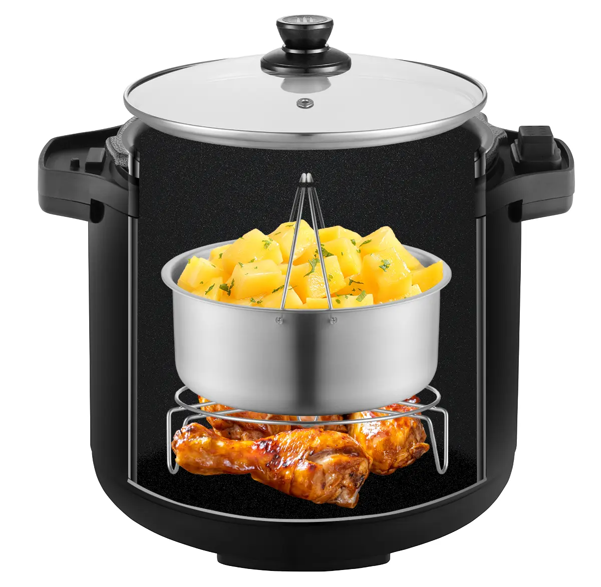 Multifunkčný hrniec je vybavený tromi špeciálnymi pokrievkami, ktoré z neho robia skutočne univerzálneho kuchynského pomocníka. Tlaková pokrievka urýchli varenie, teplovzdušná pokrievka zaistí chrumkavé výsledky pri pečení a sklenená pokrievka umožňuje pomalé varenie s neustálym prehľadom nad pokrmom.