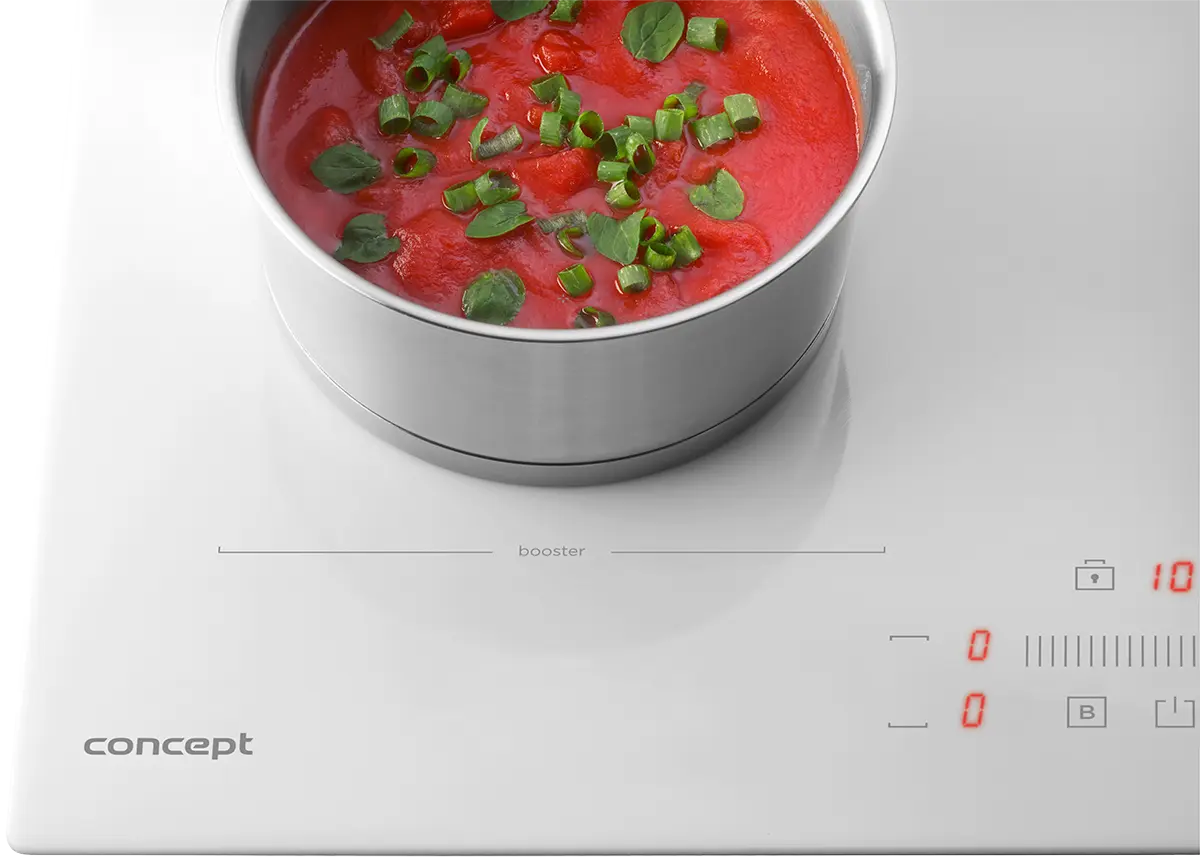 Indukčná doska IDV5160wh ponúka rýchle a úsporné varenie, jednoduchú údržbu a bezpečnú prevádzku. Je spracovaná v atraktívnom dizajne bieleho skla s minimalistickou potlačou. Disponuje 4 varnými zónami, ktoré sú vybavené funkciou Powerbooster na dosiahnutie extrémne rýchleho ohrevu.
