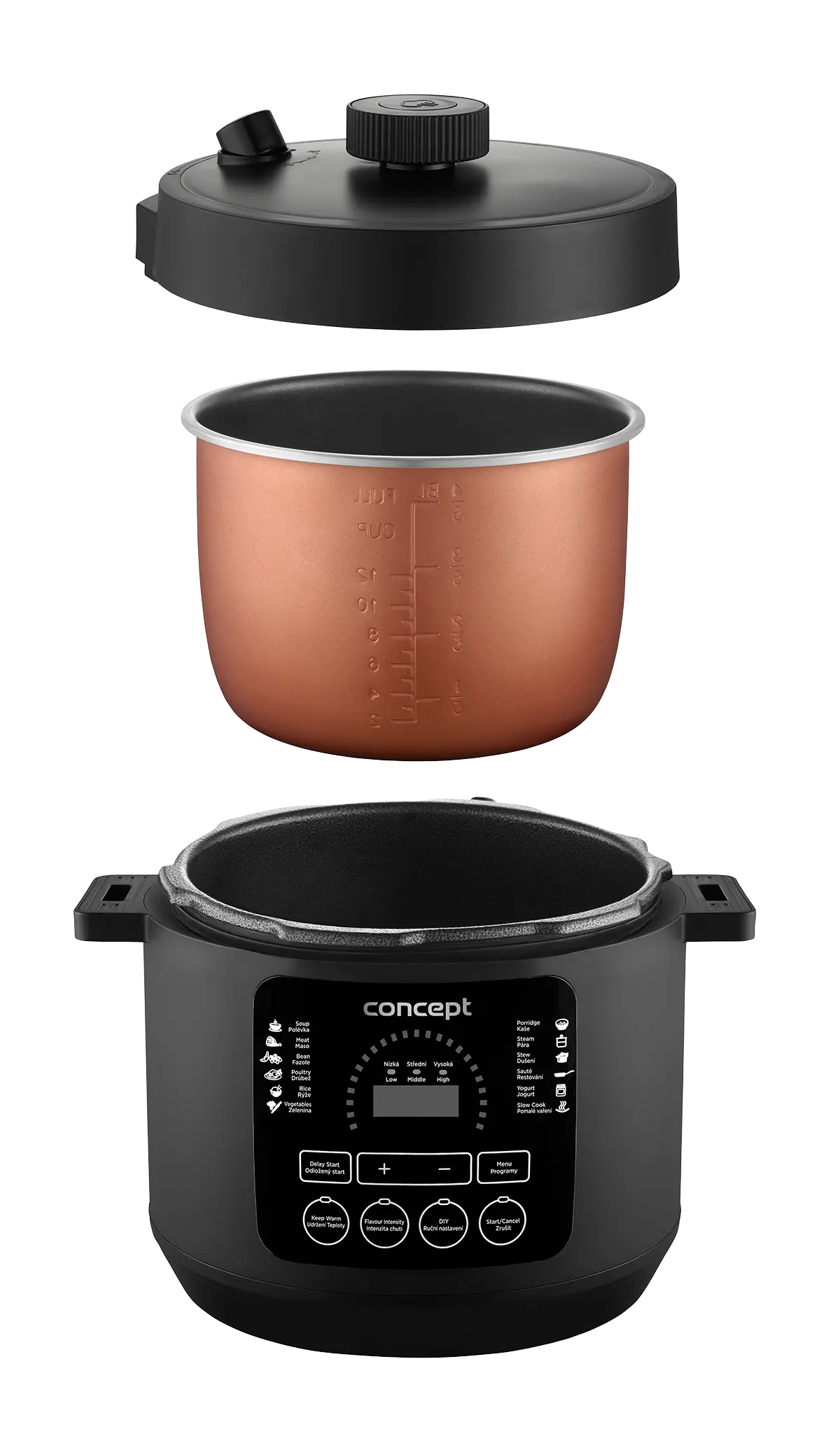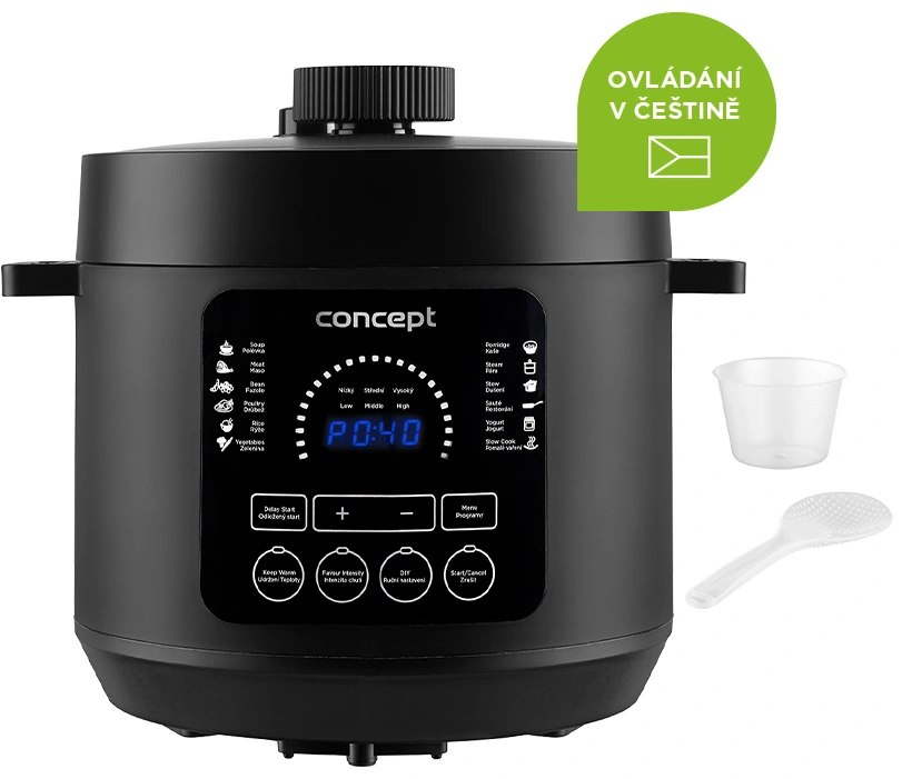 Multifunkčný tlakový hrniec ponúka 12 prednastavených programov (polievka, mäso, fazuľa, hydina, ryža, zelenina, kaša, para, dusenie, restovanie, jogurt a pomalé varenie), ktoré uľahčujú prípravu pokrmov. K dispozícii je tiež manuálny režim, funkcia na udržiavanie teploty Keep Warm a možnosť nastavenia odloženého spustenia. Disponuje ovládacím panelom v češtine, čo značne uľahčuje jeho používanie. Vďaka jednoduchému rozhraniu v rodnom jazyku nastavíte všetky potrebné funkcie rýchlo a bez problémov bez toho, aby ste museli riešiť zložité preklady alebo návod.