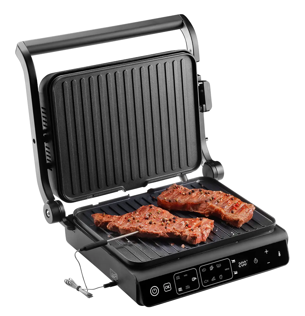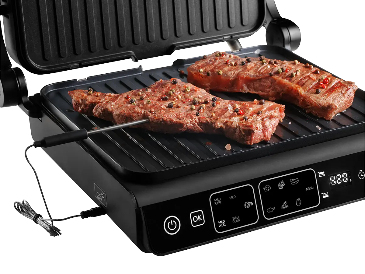 Kontaktný gril Concept GE3600 je vybavený praktickou teplotnou sondou, ktorú oceníte predovšetkým pri príprave mäsa. Sonda sleduje vnútornú teplotu pokrmu a zobrazí ju priamo na displeji grilu, čo vám umožní ľahko kontrolovať úroveň prepečenia . Jednoducho ju zapichnite do mäsa a nechajte gril postrážiť dokonalý výsledok - či už máte radi mäso šťavnaté alebo viac prepečené. Grilovanie s touto funkciou bude o poznanie jednoduchšie a presnejšie.