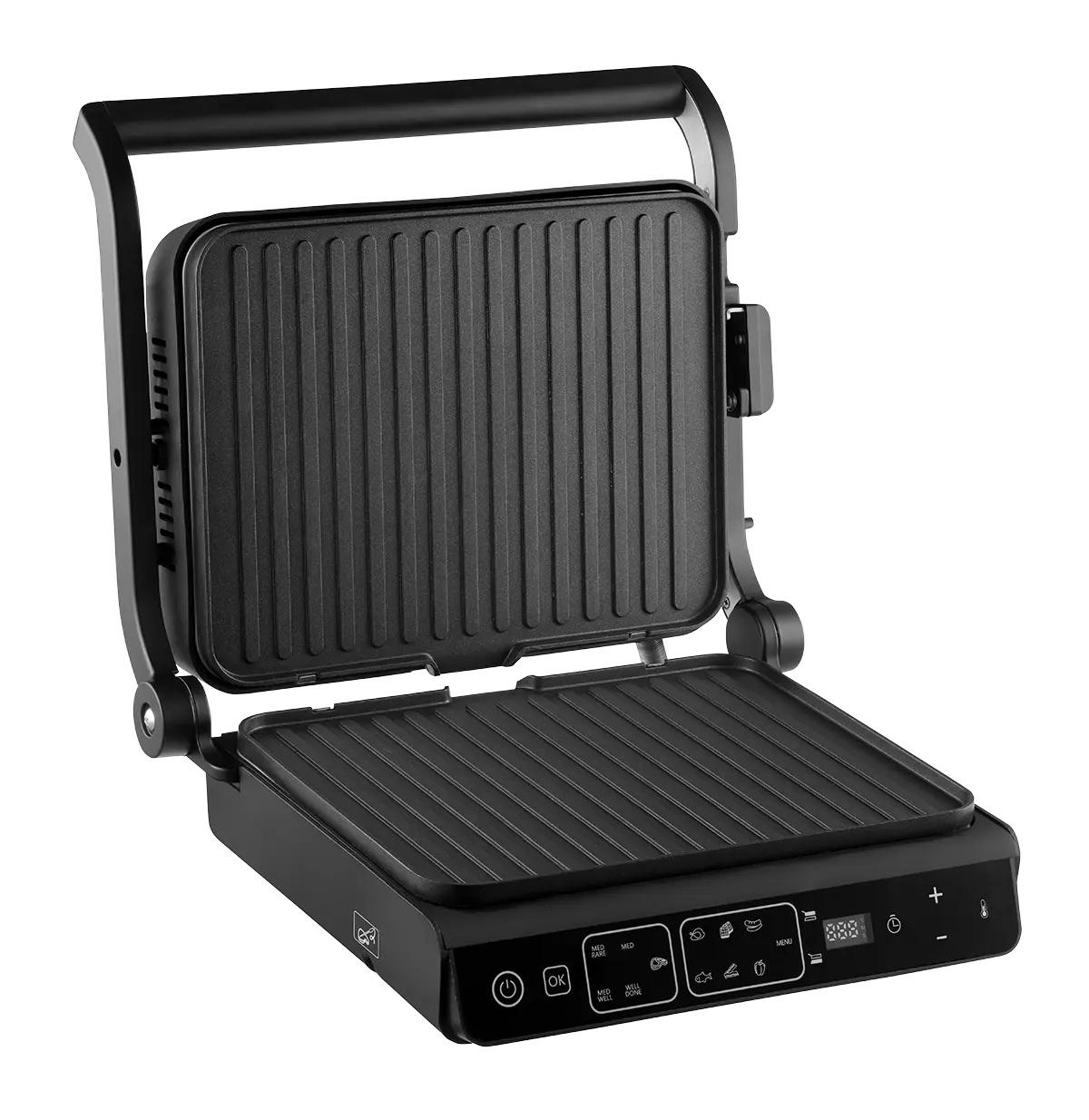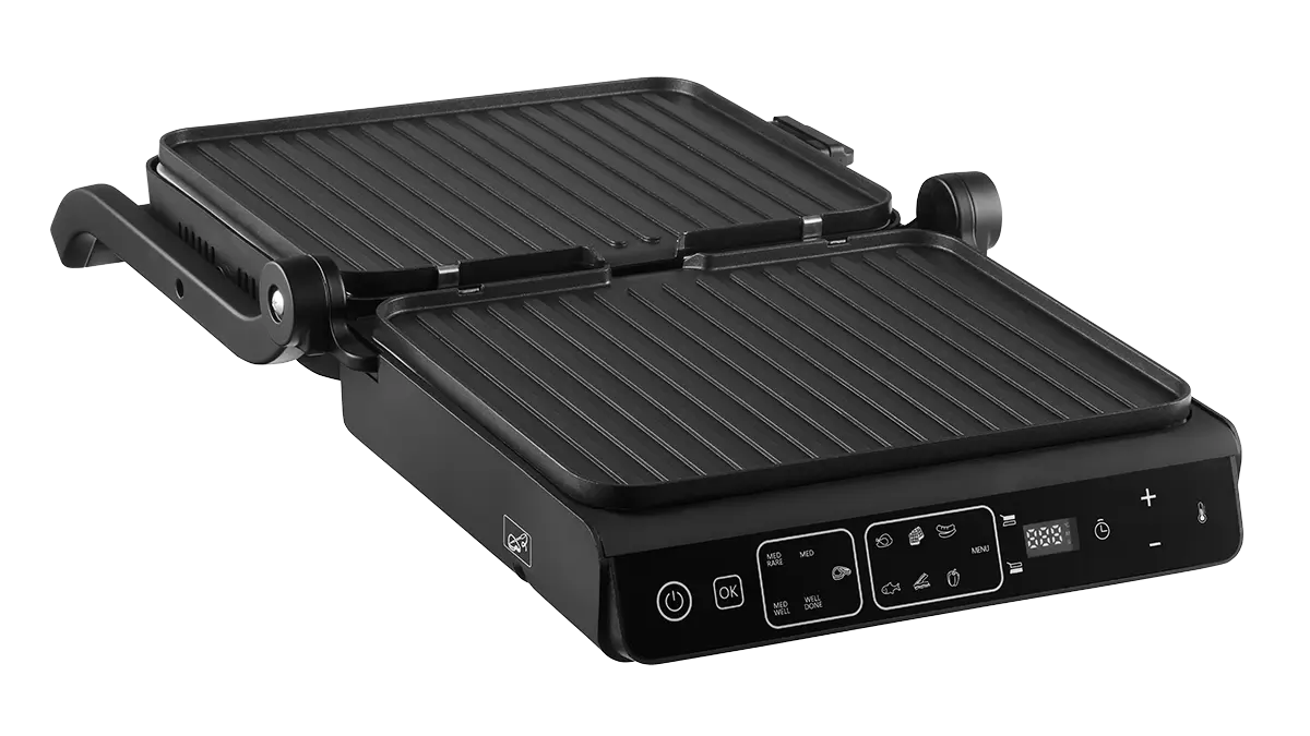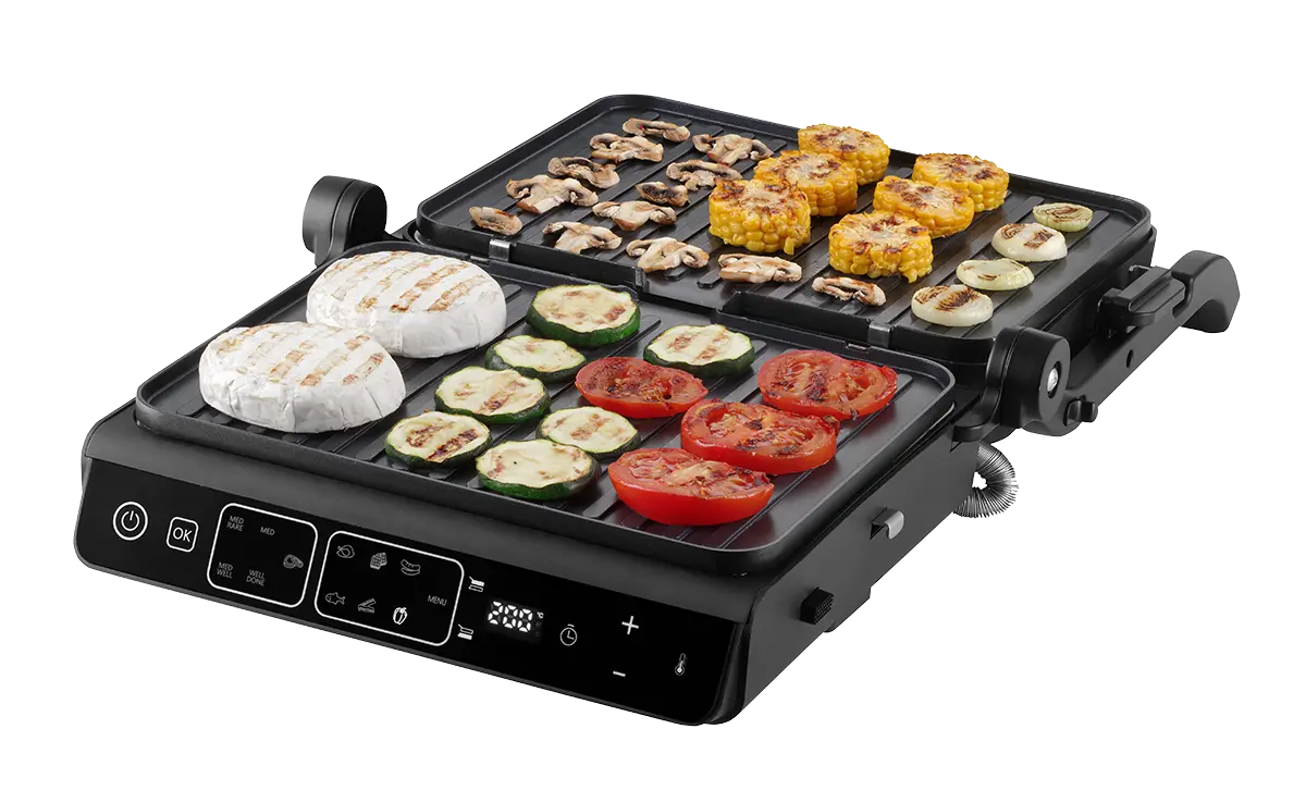 Kontaktný gril GE3600 sa ľahko ovláda vďaka 10 automatických programov, vrátane manuálneho režimu DIY. Stačí vložiť ingrediencie, vybrať zodpovedajúci program a gril automaticky nastaví ideálnu teplotu aj čas. Pripravíte na ňom všetko od dokonale prepečených steakov, slaniny, hydiny, rýb, až po zeleninu alebo sendviče. Nastavené hodnoty môžete sledovať na prehľadnom digitálnom displeji.