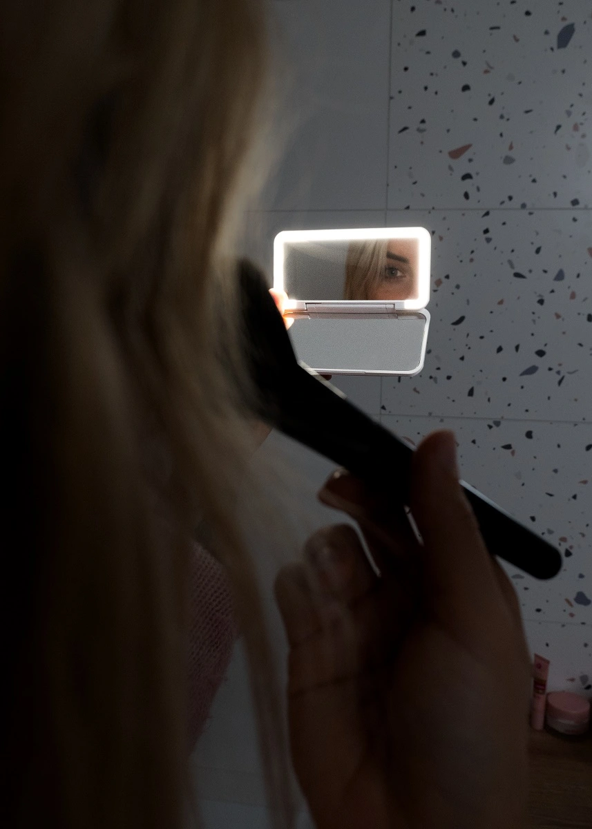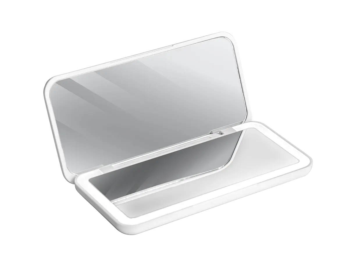 Kozmetické zrkadlo vyniká kompaktnou veľkosťou, LED osvetlením, dvojnásobným zoomom a moderným dizajnom. Je vybavené Li-Ion batériou, ktorá poskytuje až 3 h svietenia na jedno nabitie a praktickým cestovným puzdrom, ktoré chráni zrkadlo pred poškodením.