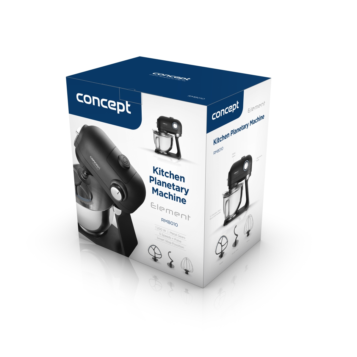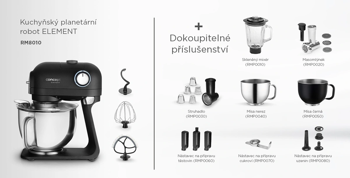 Kuchynský planetárny robot Concept RM8000 ELEMENT s príkonom 1200 W sa stane univerzálnym pomocníkom v každej kuchyni. Kovové telo vr. vnútorných prevodov je zárukou dlhej životnosti a vďaka bohatému príslušenstvu ponúka skutočne široké využitie. Vie šľahať, miešať, hnevať cesto, mixovať, strúhať, mlieť mäso, plniť párky a klobásy, vyrábať domáce pečivo aj čerstvé cestoviny vďaka pasta makier nástavcu.