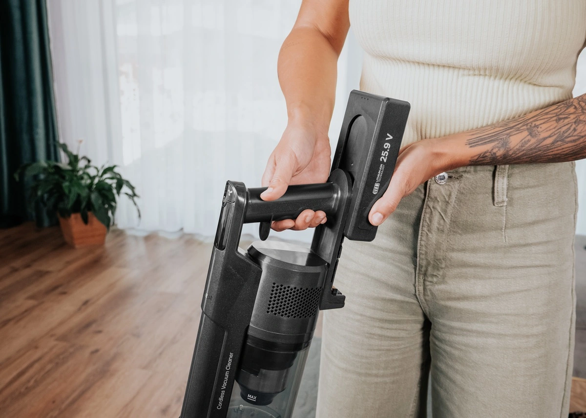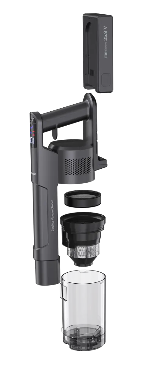 Tyčový vysávač 3 v 1 Ultimate Light Complete 25,9 V Concept VP6310 vám dopraje pohodlné upratovanie bez obmedzenia. Vďaka vyberateľnej Li-Ion batérii s kapacitou 2200 mAh zvládne až 50 minút prevádzky na jedno nabitie v režime MIN, čo je dostačujúci výkon na bežné upratovanie tvrdých podláh. Vysávač plne dobijete za 3,5 hodiny, a to dvoma spôsobmi – buď ho vložíte do nabíjacej stanice, alebo pripojíte adaptér priamo do portu batérie.