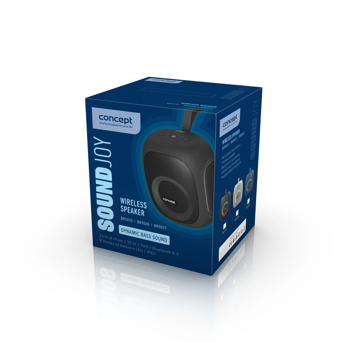 Bezdrôtový reproduktor SoundJoy Concept BR5035 s výkonom 35 W ponúka maximálnu výdrž 46 h, ambient LED osvetlenie, stabilné a rýchle pripojenie Bluetooth 5.3, vodeodolnosť IPX5, funkciu handsfree, TWS aj powerbanku - ideálny pre párty doma aj vonku.
